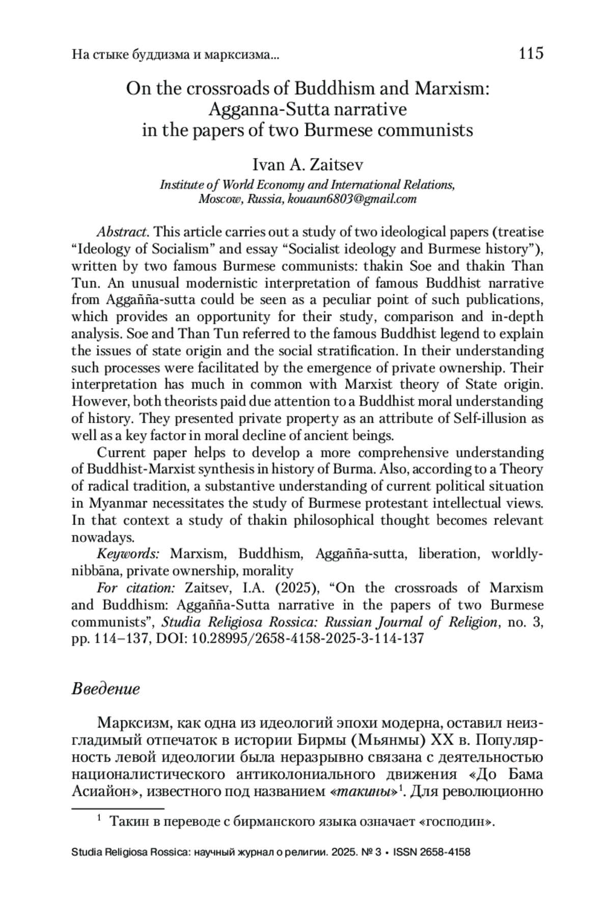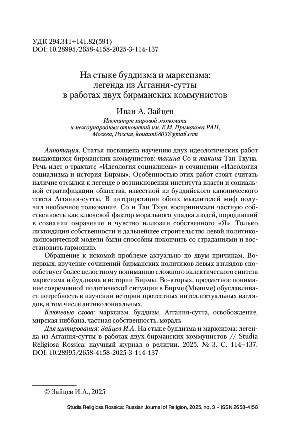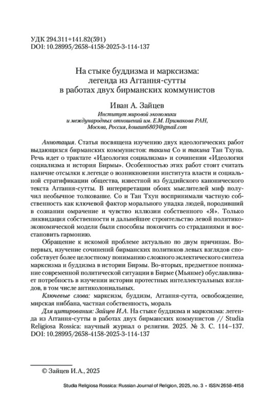Статья посвящена изучению двух идеологических работ выдающихся бирманских коммунистов: такина Со и такина Тан Тхуна. Речь идет о трактате «Идеология социализма» и сочинении «Идеология социализма и история Бирмы». Особенностью этих работ стоит считать наличие отсылки к легенде о возникновении института власти и социальной стратификации общества, известной из буддийского канонического текста Аггання-сутты. В интерпретации обоих мыслителей миф получил необычное толкование. Со и Тан Тхун воспринимали частную собственность как ключевой фактор морального упадка людей, породивший в сознании омрачение и чувство иллюзии собственного «Я». Только ликвидация собственности и дальнейшее строительство левой политико-экономической модели были способны покончить со страданиями и восстановить гармонию.