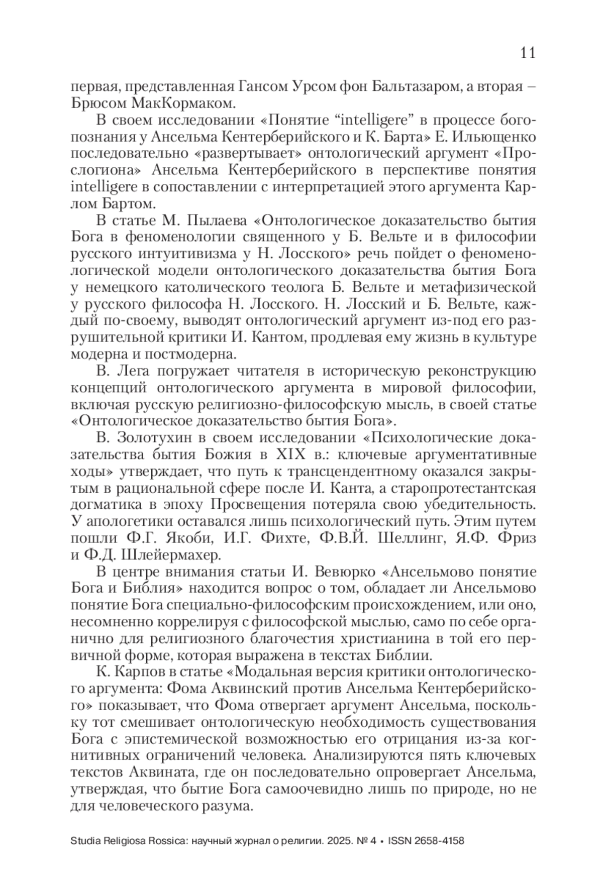 Статья посвящена исследованию роли интерпретации онтологического аргумента Ансельма Кентерберийского в творчестве Карла Барта, одного из крупнейших представителей протестантского богословия XX в. Автор акцентирует внимание на том, как Барт формулировал этот аргумент в рамках своей словоцентристской теологии, стремясь отвергнуть любые формы зависимости от философии. Цель исследования – выявить особенности понимания роли онтологического аргумента в двух ключевых традициях изучения творчества Барта: первая, представленная Гансом Урсом фон Бальтазаром, а вторая – Брюсом МакКормаком. Бальтазар подчеркивает значение двух «обращений» Барта, в особенности того, что происходило от диалектической теологии к аналогии веры (analogia fidei) и которое фиксируется с выходом работы «Fides quaerens intellectum». МакКормак, напротив, делает упор на плавном и постепенном развитии и считает знаковой работой для Барта «Гёттингенскую догматику», но не «Fides quaerens intellectum». В статье проводится детальное сопоставление подходов обеих традиций к пониманию интерпретации Бартом онтологического аргумента, демонстрируя, каким образом каждая из них интерпретирует как интеллектуальное развитие Барта в целом, так и его мысль в «Fides quaerens intellectum». Также в статье рассмотрены взгляды современных ученых на роль работы «Fides quaerens intellectum» и их связь с парадигмами Бальтазара и МакКормака.
