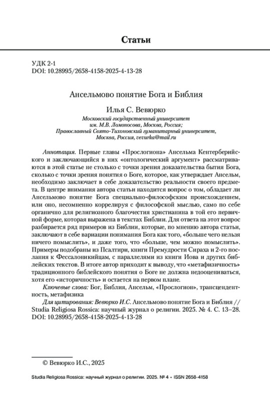 Первые главы «Прослогиона» Ансельма Кентерберийского и заключающийся в них «онтологический аргумент» рассматриваются в этой статье не столько с точки зрения доказательства бытия Бога, сколько с точки зрения понятия о Боге, которое, как утверждает Ансельм, необходимо заключает в себе доказательство реальности своего предмета. В центре внимания автора статьи находится вопрос о том, обладает ли Ансельмово понятие Бога специально-философским происхождением, или оно, несомненно коррелируя с философской мыслью, само по себе органично для религиозного благочестия христианина в той его первичной форме, которая выражена в текстах Библии. Для ответа на этот вопрос разбирается ряд примеров из Библии, которые, по мнению автора статьи, заключают в себе вариации понимания Бога как того, «больше чего нельзя ничего помыслить», и даже того, что «больше, чем можно помыслить». Примеры подобраны из Псалтири, книги Премудрости Сираха и 2-го послания к Фессалоникийцам, с параллелями из книги Иова и других библейских текстов. В итоге автор приходит к выводу, что «метафизичность» традиционного библейского понятия о Боге не должна недооцениваться, хотя его «историчность» и остается на первом плане.