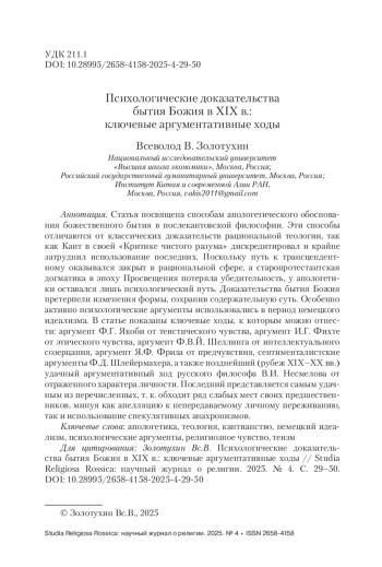 Статья посвящена способам апологетического обоснования божественного бытия в послекантовской философии. Эти способы отличаются от классических доказательств рациональной теологии, так как Кант в своей «Критике чистого разума» дискредитировал и крайне затруднил использование последних. Поскольку путь к трансцендентному оказывался закрыт в рациональной сфере, а старопротестантская догматика в эпоху Просвещения потеряла убедительность, у апологетики оставался лишь психологический путь. Доказательства бытия Божия претерпели изменения формы, сохранив содержательную суть. Особенно активно психологические аргументы использовались в период немецкого идеализма. В статье показаны ключевые ходы, к которым можно отнести: аргумент Ф. Г. Якоби от теистического чувства, аргумент И. Г. Фихте от этического чувства, аргумент Ф. В. Й. Шеллинга от интеллектуального созерцания, аргумент Я. Ф. Фриза от предчувствия, сентименталистские аргументы Ф. Д. Шлейермахера, а также позднейший (рубеж XIX–XX вв.) удачный аргументативный ход русского философа В. И. Несмелова от отраженного характера личности. Последний представляется самым удачным из перечисленных, т. к. обходит ряд слабых мест своих предшественников, минуя как апелляцию к непередаваемому личному переживанию, так и использование спекулятивных анахронизмов.