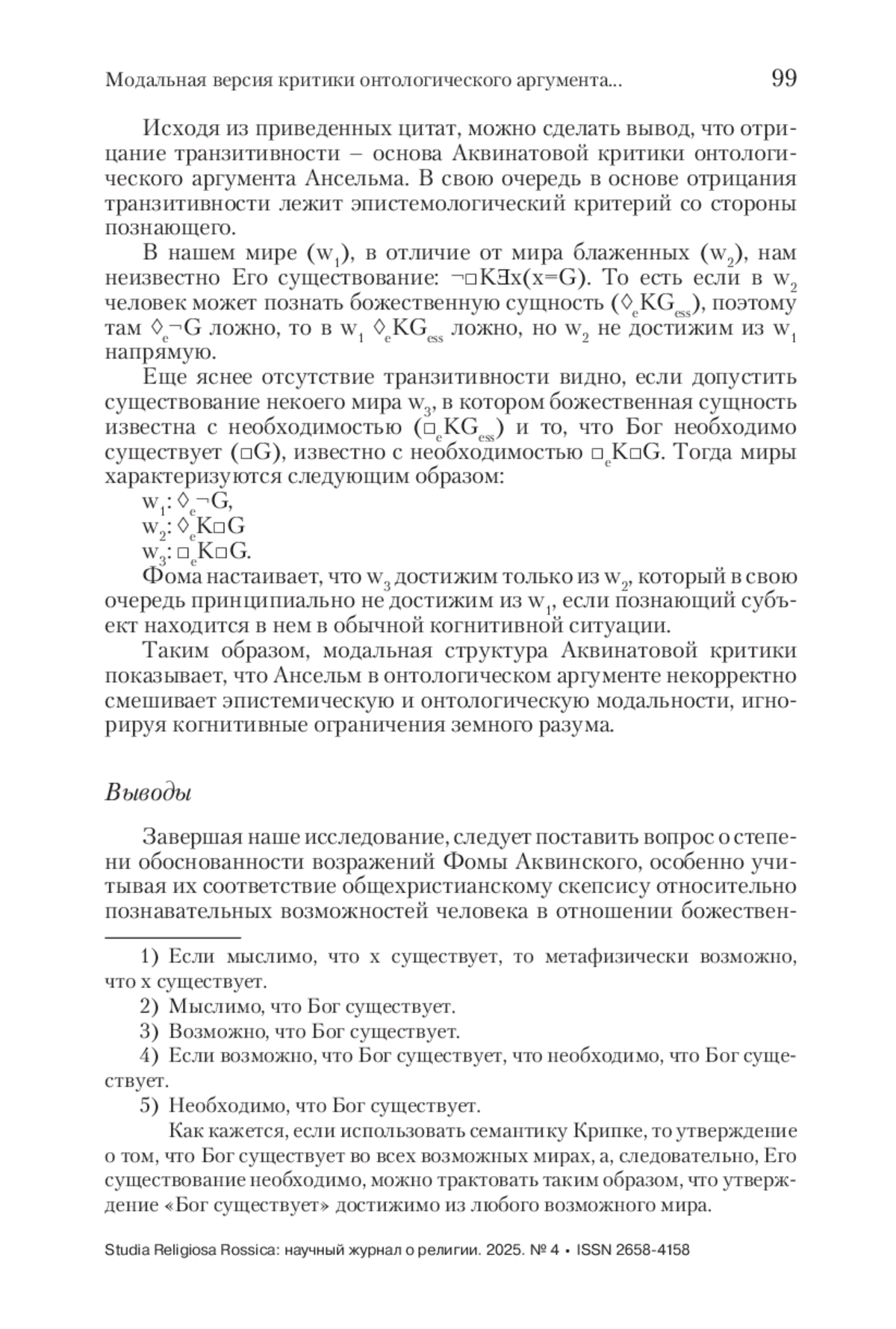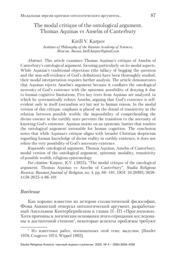 В статье исследуется критика Фомой Аквинским онтологического аргумента Ансельма Кентерберийского, в частности, ее модальные аспекты. Хотя традиционные возражения Аквината (ошибка предвосхищения основания и несамоочевидность определения Бога) хорошо изучены, их модальная интерпретация требует дополнительного анализа. Фома отвергает аргумент Ансельма, поскольку тот смешивает онтологическую необходимость существования Бога с эпистемической возможностью его отрицания из-за когнитивных ограничений человека. Анализируются пять ключевых текстов Аквината, где он последовательно опровергает Ансельма, утверждая, что бытие Бога самоочевидно лишь по природе, но не для человеческого разума. В модальной версии критики внимание уделяется отрицанию транзитивности отношения между мирами: невозможность познать божественную сущность в земном состоянии не позволяет перейти к необходимости знания о существовании Бога. Фома настаивает на эпистемическом барьере, делающем онтологический аргумент несостоятельным для человеческого познания. В заключении отмечается, что критика Аквината, хотя и соответствует общехристианскому скепсису относительно познания божественной реальности человеком в его земном бытии, не опровергает саму возможность необходимого существования Бога.