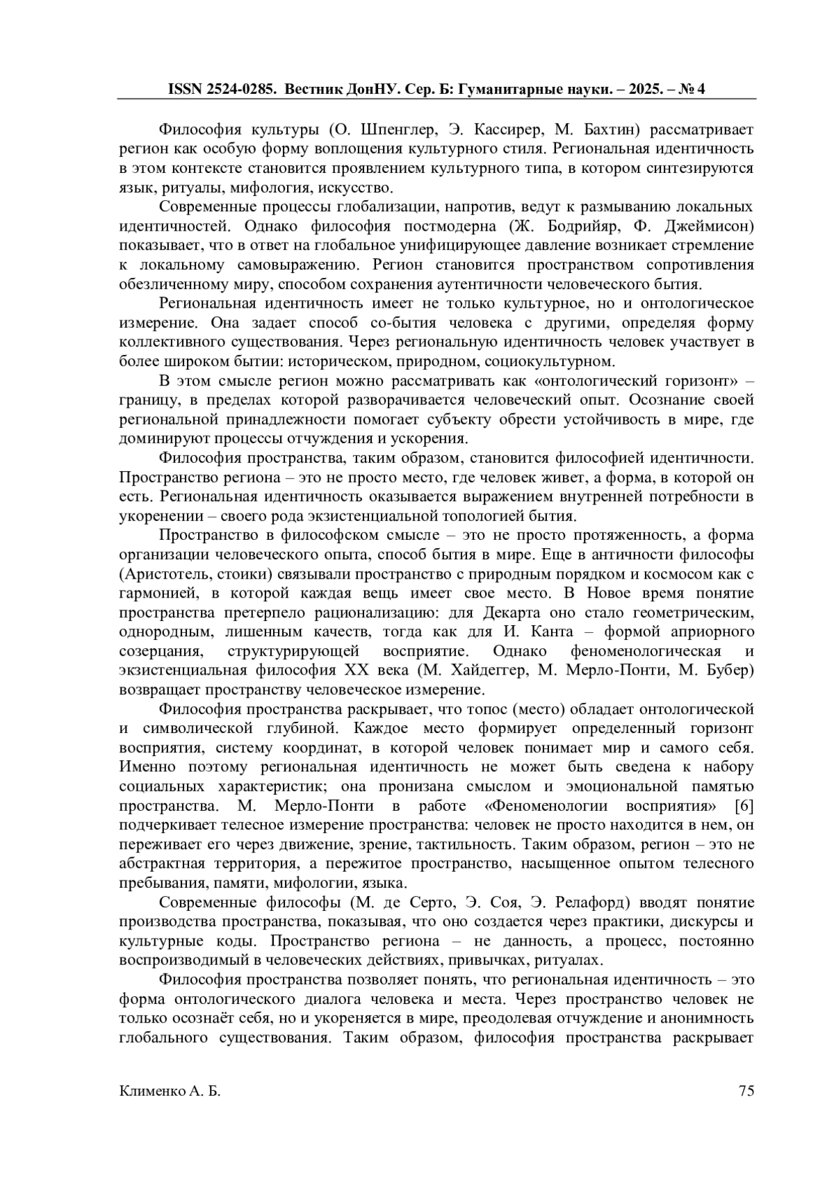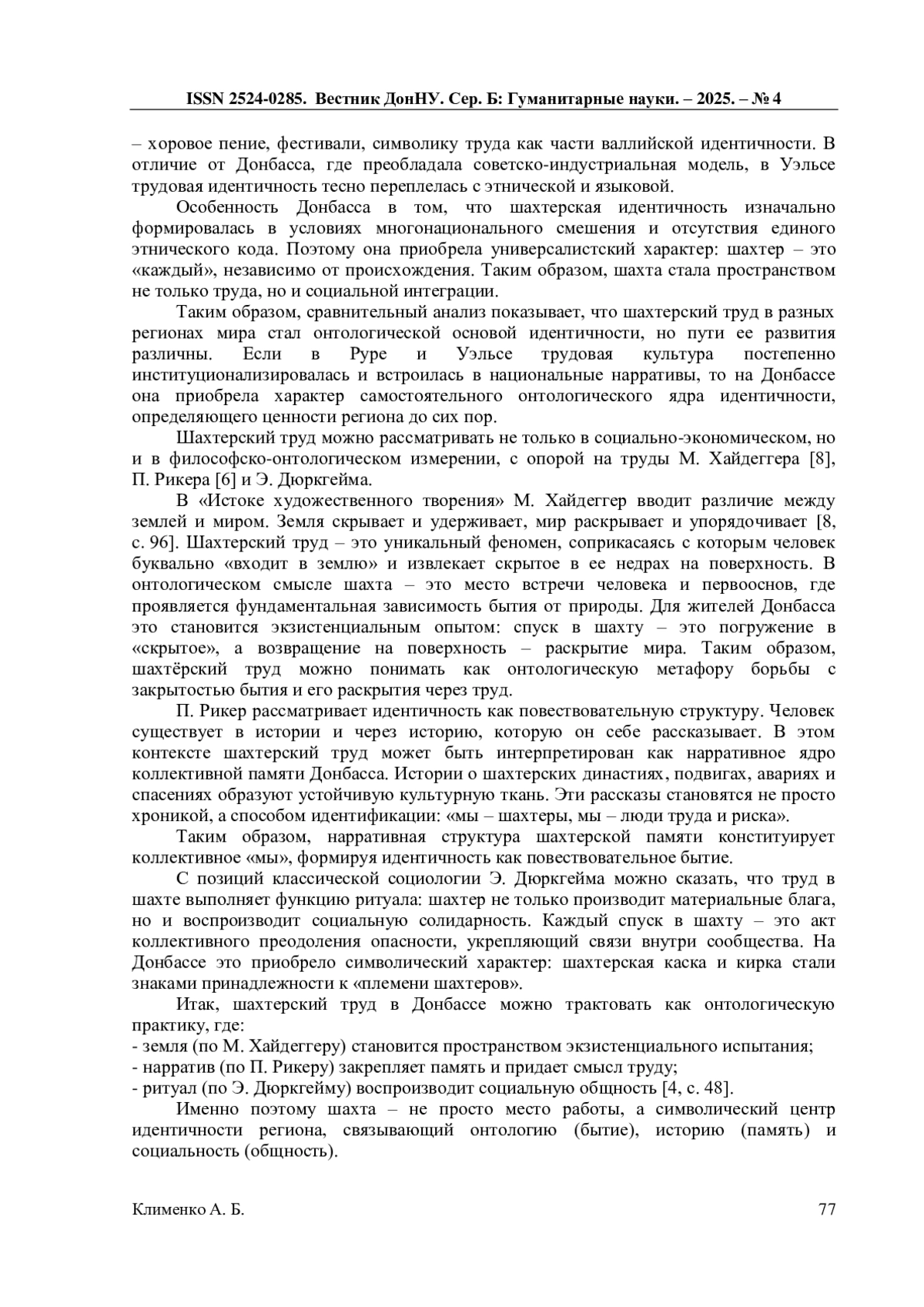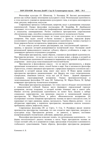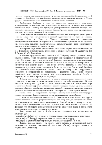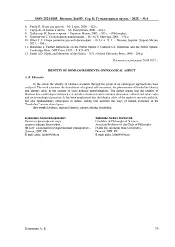 В статье анализируется идентичность жителей Донбасса через призму онтологического подхода. Рассматриваются основания регионального самосознания, феномен пограничности и кризис идентичности в условиях социально-политических трансформаций. Аргументируется идея о том, что идентичность Донбасса имеет многослойный характер: она включает историко-экзистенциальное измерение, культурно-ценностные коды и социально-онтологические практики. Подчеркивается, что кризис идентичности региона носит не только политический, но и фундаментально онтологический характер, ставящий под вопрос способы бытия человека в «пограничном» социокультурном пространстве.