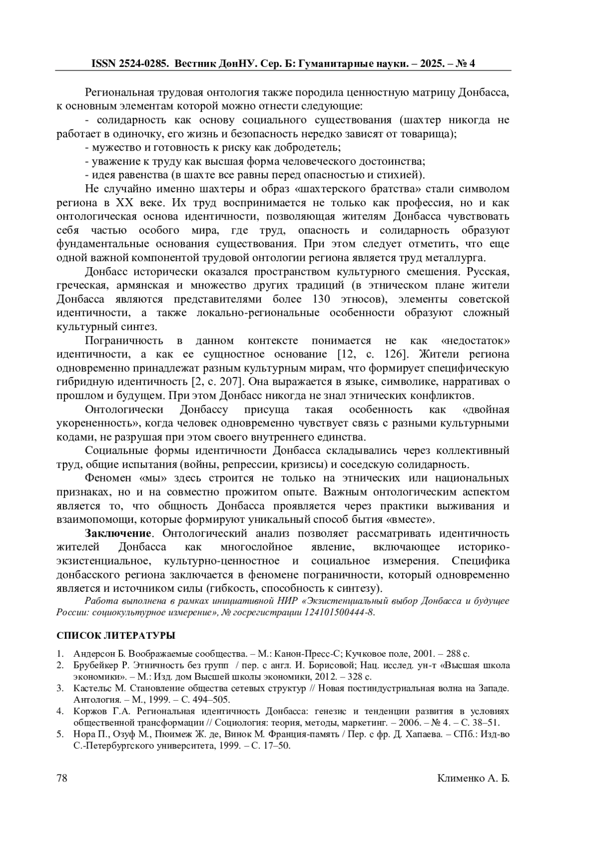 4. Коржов Г.А. Региональная идентичность Донбасса: генезис и тенденции развития в условиях общественной трансформации // Социология: теория, методы, маркетинг. - 2006. - № 4. - С. 38-51.