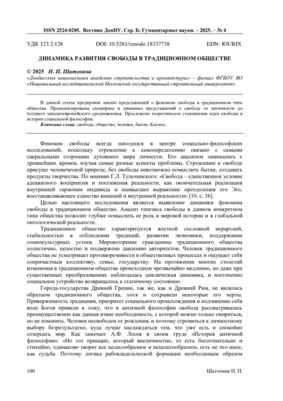 В данной статье предпринят анализ представлений о феномене свободы в традиционном типе общества. Проанализированы специфика и динамика представлений о свободе от античности до позднего западноевропейского средневековья. Прослежено теоретическое становление идеи свободы в истории социальной философии.