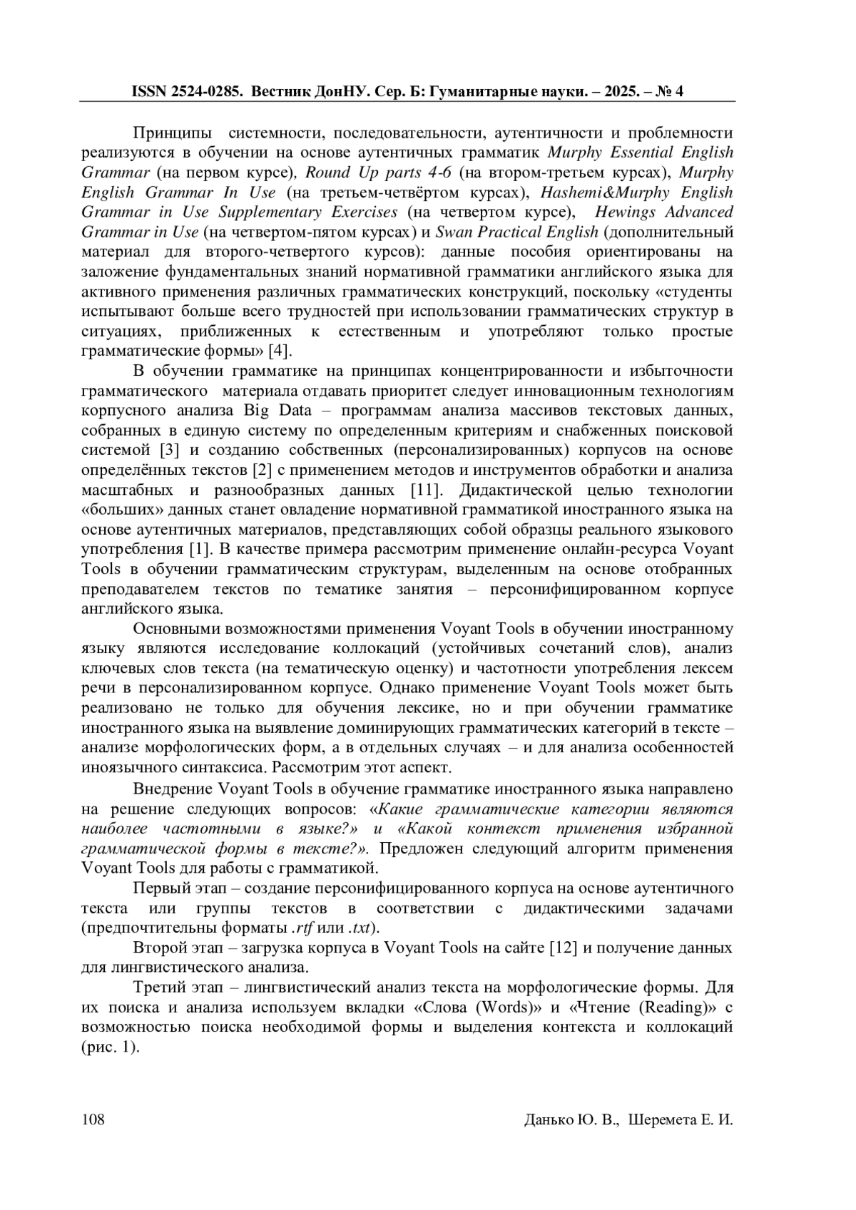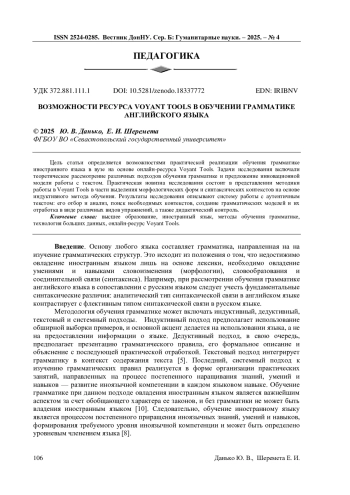 Цель статьи определяется возможностями практической реализации обучения грамматике иностранного языка в вузе на основе онлайн-ресурса Voyant Tools. Задачи исследования включали теоретическое рассмотрение различных подходов обучения грамматике и предложение инновационной модели работы с текстом. Практическая новизна исследования состоит в представлении методики работы в Voyant Tools в части выделения морфологических форм и синтаксических контекстов на основе индуктивного метода обучения. Результаты исследования описывают систему работы с аутентичным текстом: его отбор и анализ, поиск необходимых контекстов, создание грамматических моделей и их отработка в виде различных видов упражнений, а также дидактический контроль.