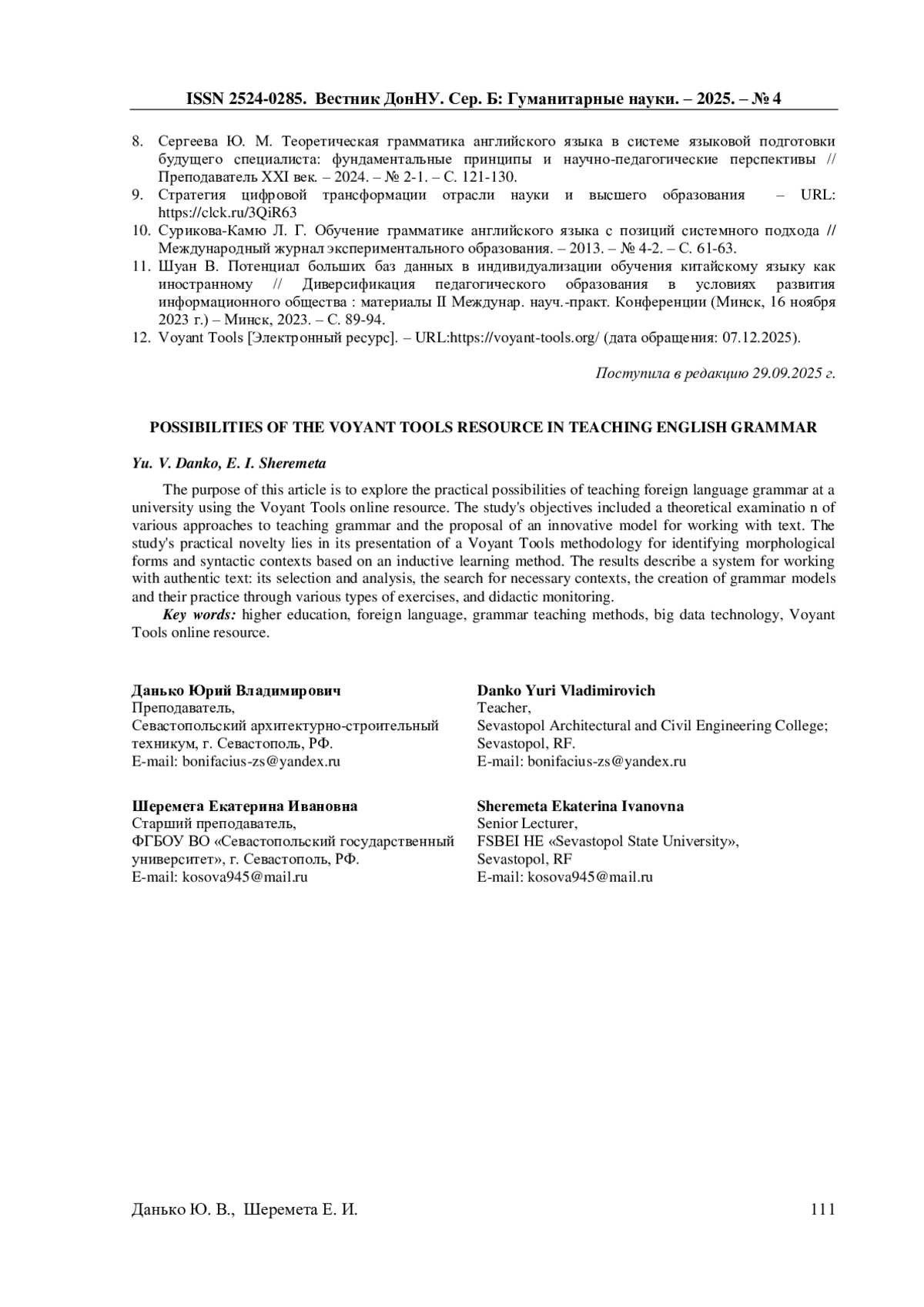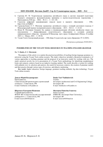 8. Сергеева Ю. М. Теоретическая грамматика английского языка в системе языковой подготовки будущего специалиста: фундаментальные принципы и научно-педагогические перспективы // Преподаватель ХХI век. - 2024. - № 2-1. - С. 121-130.