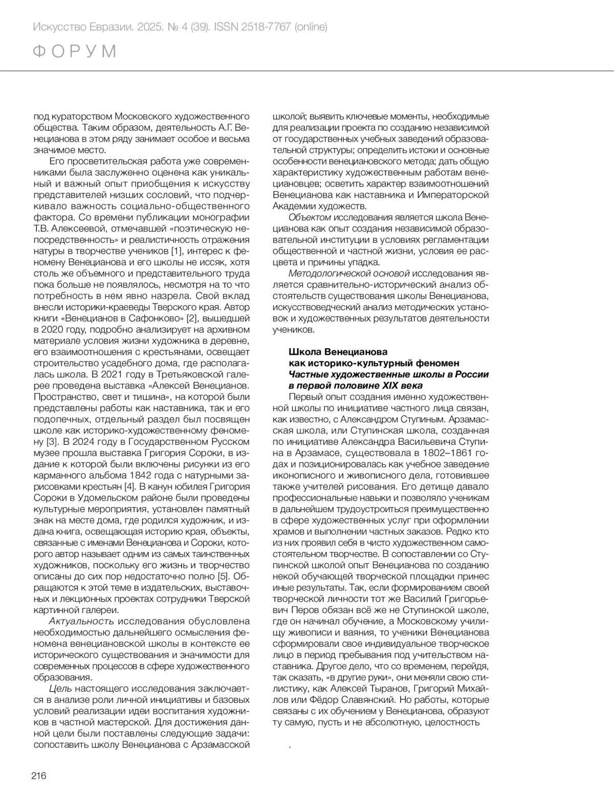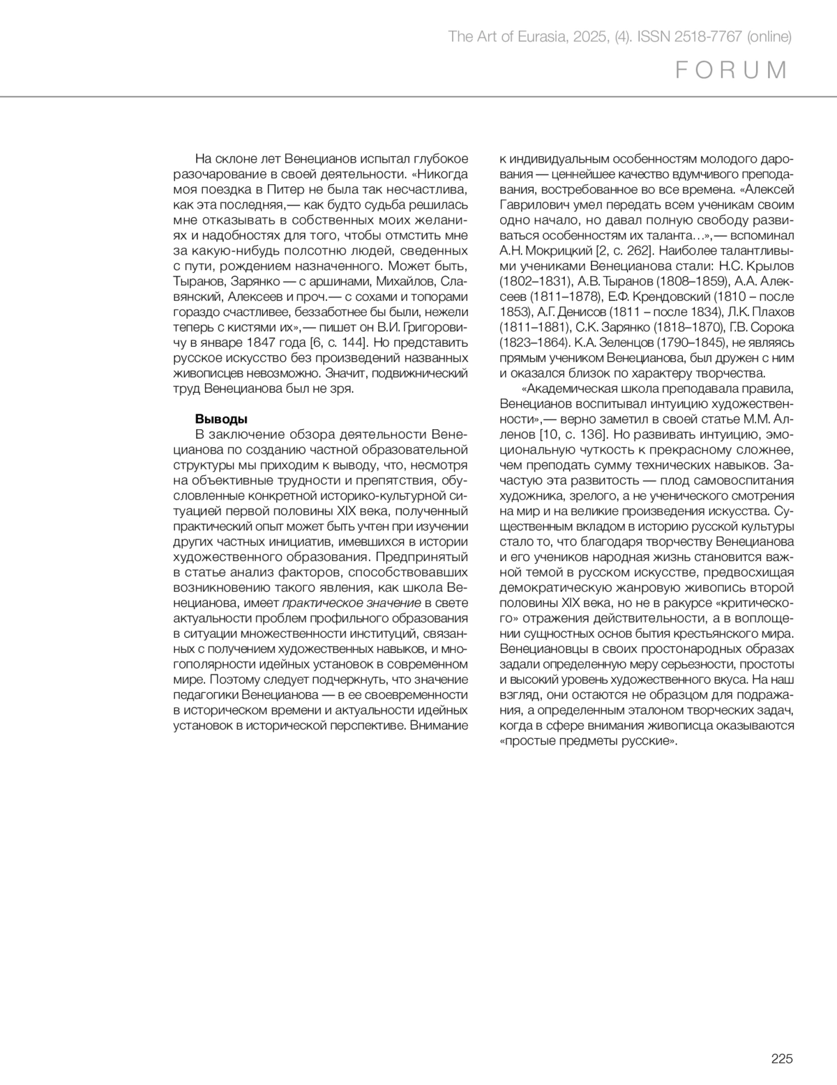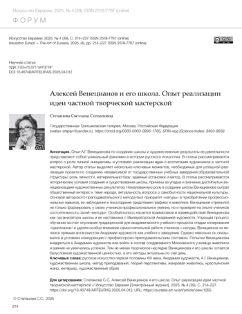 Степанова С.С. Алексей Венецианов и его школа. Опыт реализации идеи частной творческой мастерской // Искусство Евразии [Электронный журнал]. 2025. No 4 (39). С. 214–227.