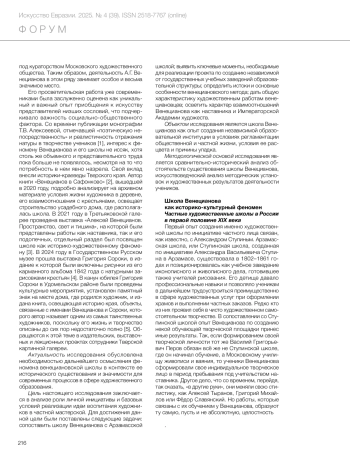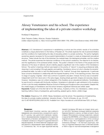 Опыт А. Г. Венецианова по созданию школы и художественные результаты ее деятельности представляют собой уникальный феномен в истории русского искусства. В статье рассматривается вопрос о роли личной инициативы и условиях реализации идеи о воспитании художников в частной мастерской. Автор статьи выделяет несколько ключевых моментов, необходимых для успешной реализации проекта по созданию независимой от государственных учебных заведений образовательной структуры: роль личности, материальную базу, идейные установки и метод. В статье рассматриваются исторические условия создания и существования школы, причины ее упадка и значение достигнутых венециановцами художественных результатов. Немаловажную роль в создании школы Венецианова сыграл общественный интерес к теме народа, актуальность вопроса о самобытности национальной культуры. Основой авторского преподавательского метода был приоритет «натуры» в приобретении профессиональных навыков, ее наблюдения и воссоздания средствами графики и живописи. Венецианов стремился не только формировать у своих учеников профессиональное умение, но и проверял на опыте учеников состоятельность своей «методы». Особый вопрос касается взаимосвязи и взаимодействия Венецианова как организатора школы и ее наставника с Императорской Академией художеств. Упрощая процесс обучения за счет опускания традиционной для академического учебного процесса стадии копирования «оригиналов» и уделяя особое внимание самостоятельной работе учеников с натуры, Венецианов не являлся прямым антагонистом Академии художеств как учебного заведения. Однако невольно он оказывался в условиях конкуренции с профессорско-преподавательским составом. Попытки Венецианова внедриться в Академию художеств или войти в состав создаваемого Московского училища живописи и ваяния не увенчались успехом. Тем не менее творческое наследие Венецианова и его школы остается безусловной художественной ценностью, а его методы актуальны по сей день.