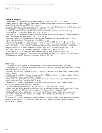 10. Allenov, M.M. (1984) ‘The image of space in painting “a’la nature”: on the nature of Venetsianov’s genre painting’, in Polevoy, V.M. (ed.) Soviet Art Studies’83, issue 1. Moscow: Sovetskiy khudozhnik Publ., pp. 123–146. (In Russ.)