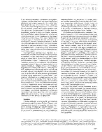 Корпоративный параметр (governance) кристаллизует стилистические аспекты произведений ювелирного дома, проявляет взаимосвязь между ювелирным наследием бренда и современными художественными практиками. С корпоративным фактором из триады ESG-факторов коррелирует и креативность как процесс создания нового на основе уже существующих элементов [9, с. 3–5], поскольку обращение к наследию ювелирного дома (интерпретация тех или иных мотивов, ис - пользование характерных художественных приемов и выразительных средств, которые проявились в знаковом для истории ювелирного дома стиле) подразумевает именно креативное начало.