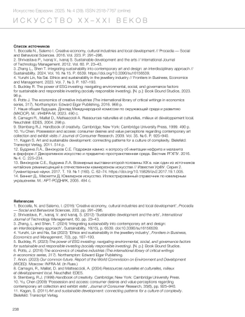 3. Zhang L., Shen T. Integrating sustainability into contemporary art and design: an interdisciplinary approach // Sustainability. 2024. Vol. 16. № 15. P. 6539. DOI: 10.3390/su16156539 EDN: SQGTXC ▼ Контекст