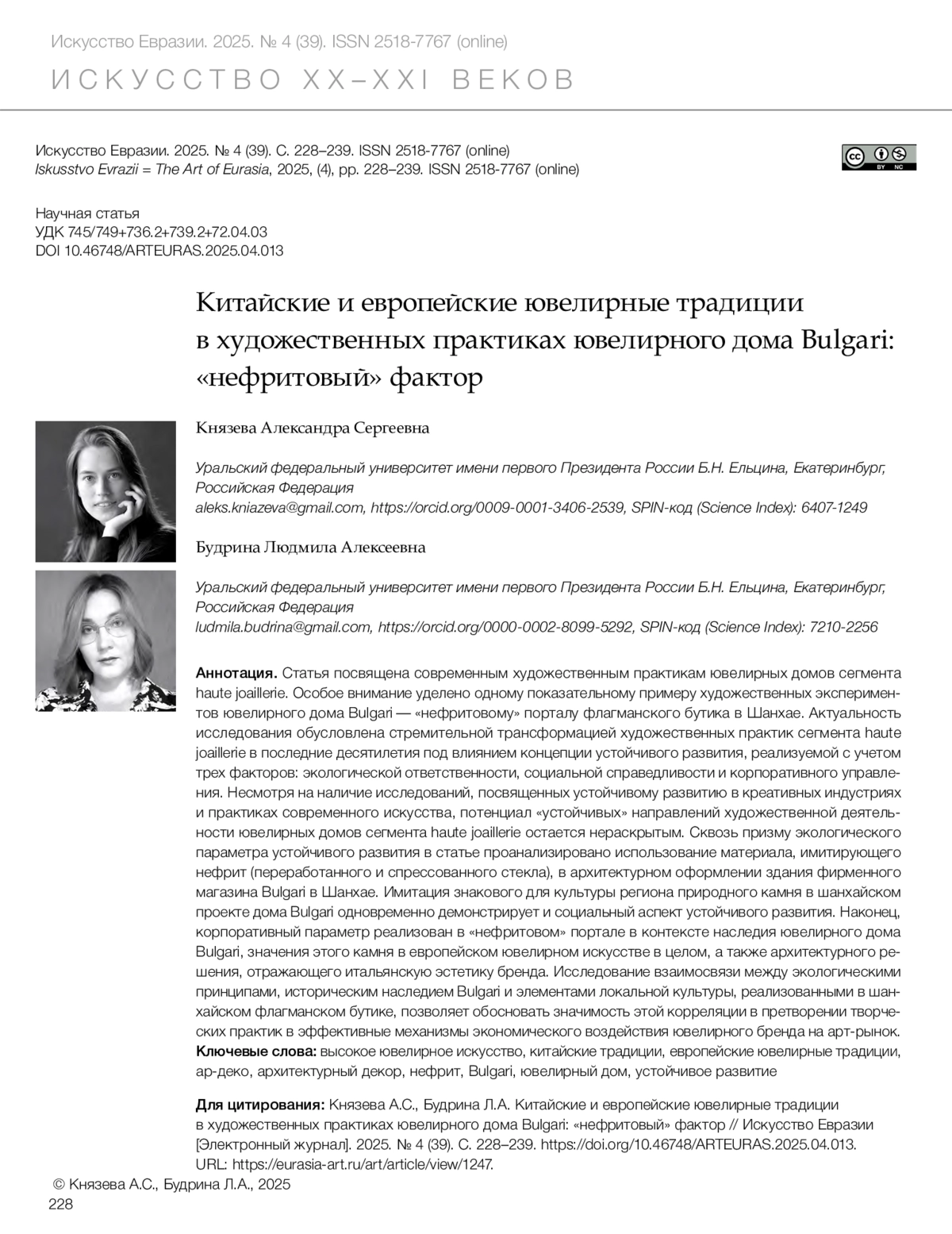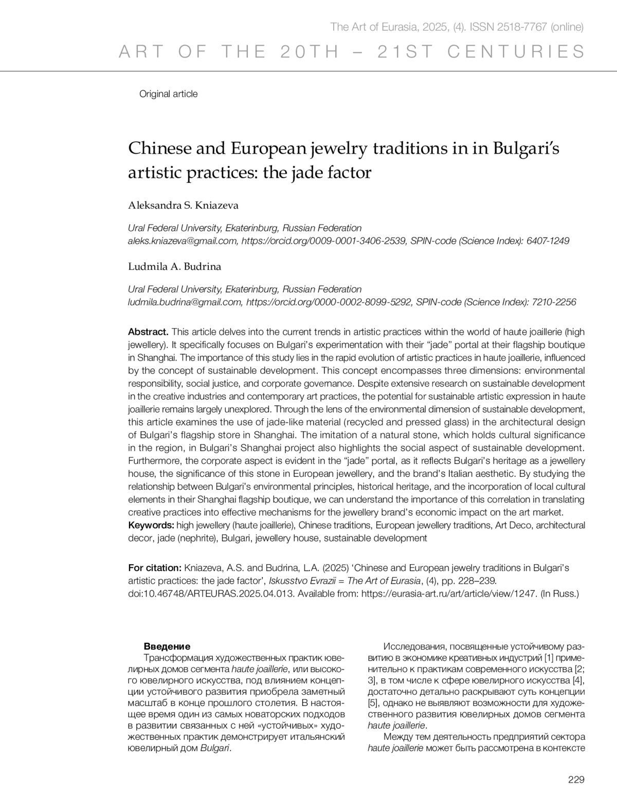 Князева А.С., Будрина Л.А. Китайские и европейские ювелирные традиции в художественных практиках ювелирного дома Bulgari: «нефритовый» фактор // Искусство Евразии