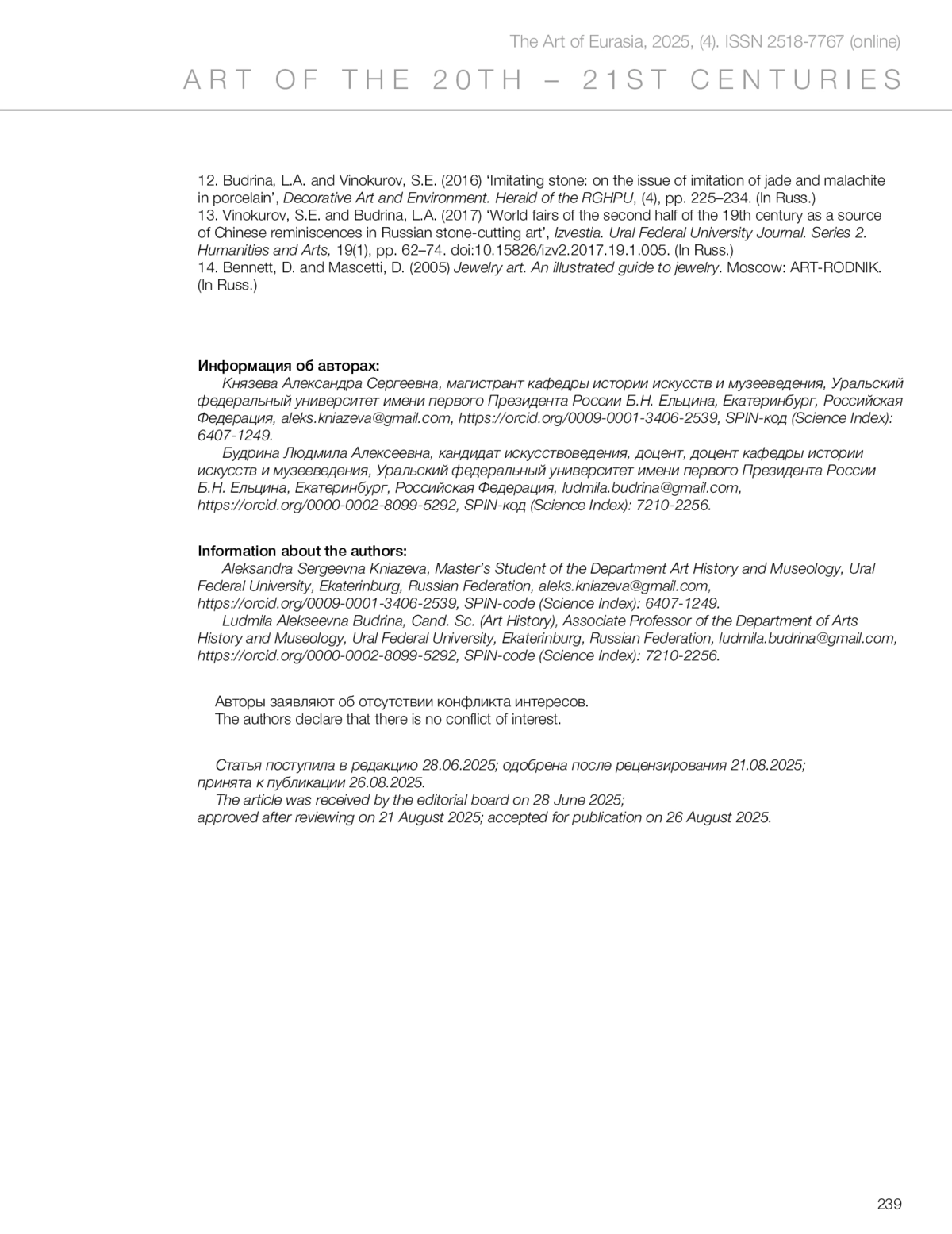 12. Budrina, L.A. and Vinokurov, S.E. (2016) ‘Imitating stone: on the issue of imitation of jade and malachite in porcelain’, Decorative Art and Environment. Herald of the RGHPU, (4), pp. 225–234. (In Russ.)
