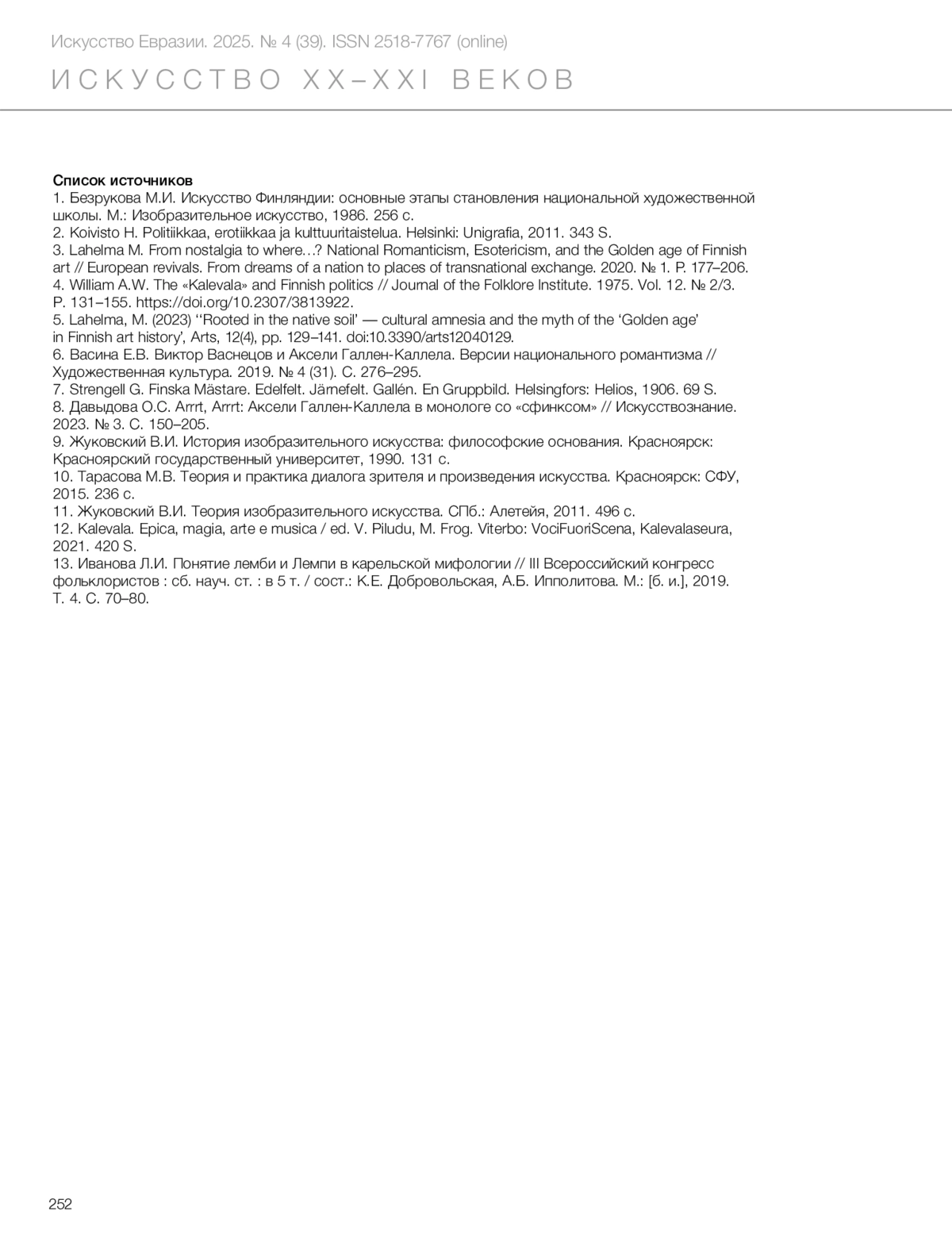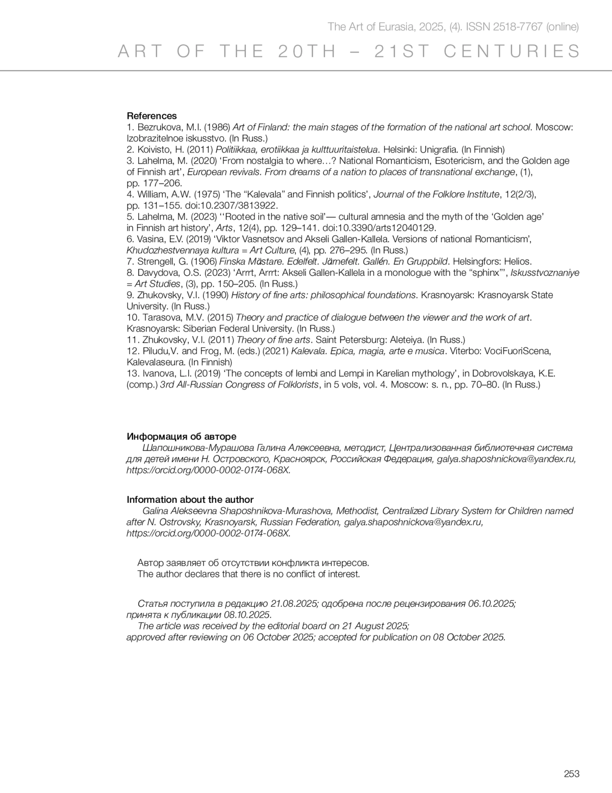 8. Davydova, O.S. (2023) ‘Arrrt, Arrrt: Akseli Gallen‑Kallela in a monologue with the “sphinx”’, Iskusstvoznaniye = Art Studies, (3), pp. 150–205. (In Russ.)