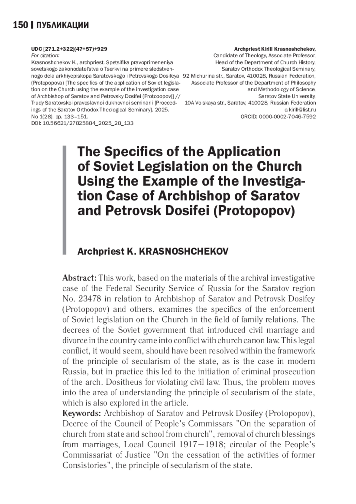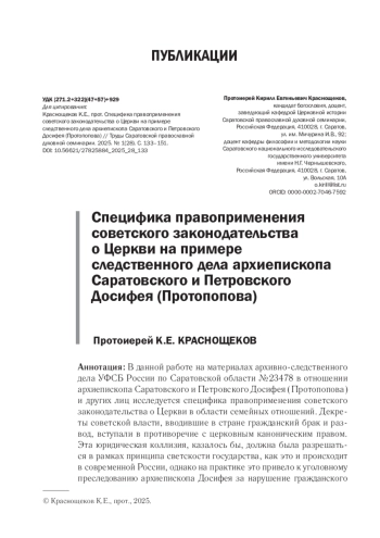 В данной работе на материалах архивно-следственного дела УФСБ России по Саратовской области №23478 в отношении архиепископа Саратовского и Петровского Досифея (Протопопова) и других лиц исследуется специфика правоприменения советского законодательства о Церкви в области семейных отношений. Декреты советской власти, вводившие в стране гражданский брак и развод, вступали в противоречие с церковным каноническим правом. Эта юридическая коллизия, казалось бы, должна была разрешаться в рамках принципа светскости государства, как это и происходит в современной России, однако на практике это привело к уголовному преследованию архиепископа Досифея за нарушение гражданского законодательства. Таким образом, проблема перешла в область понимания принципа светскости государства, который также исследуется в статье.