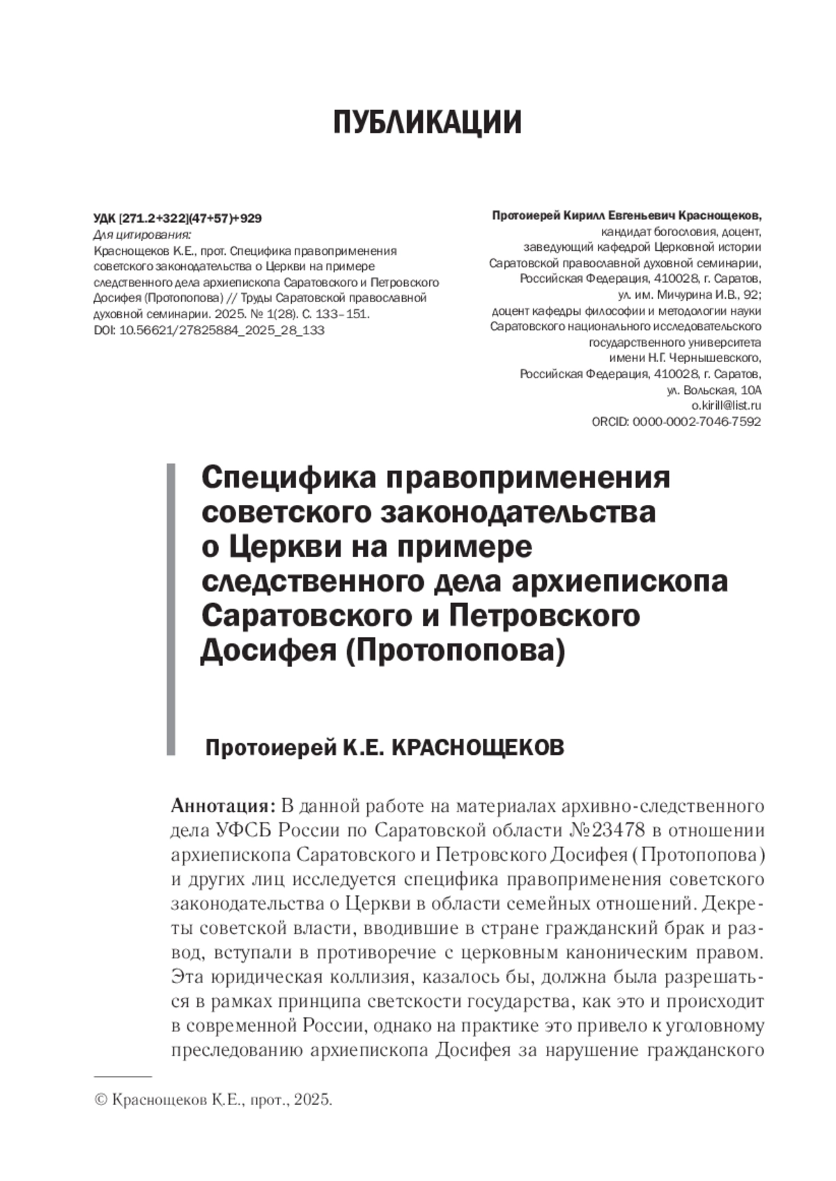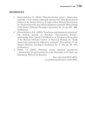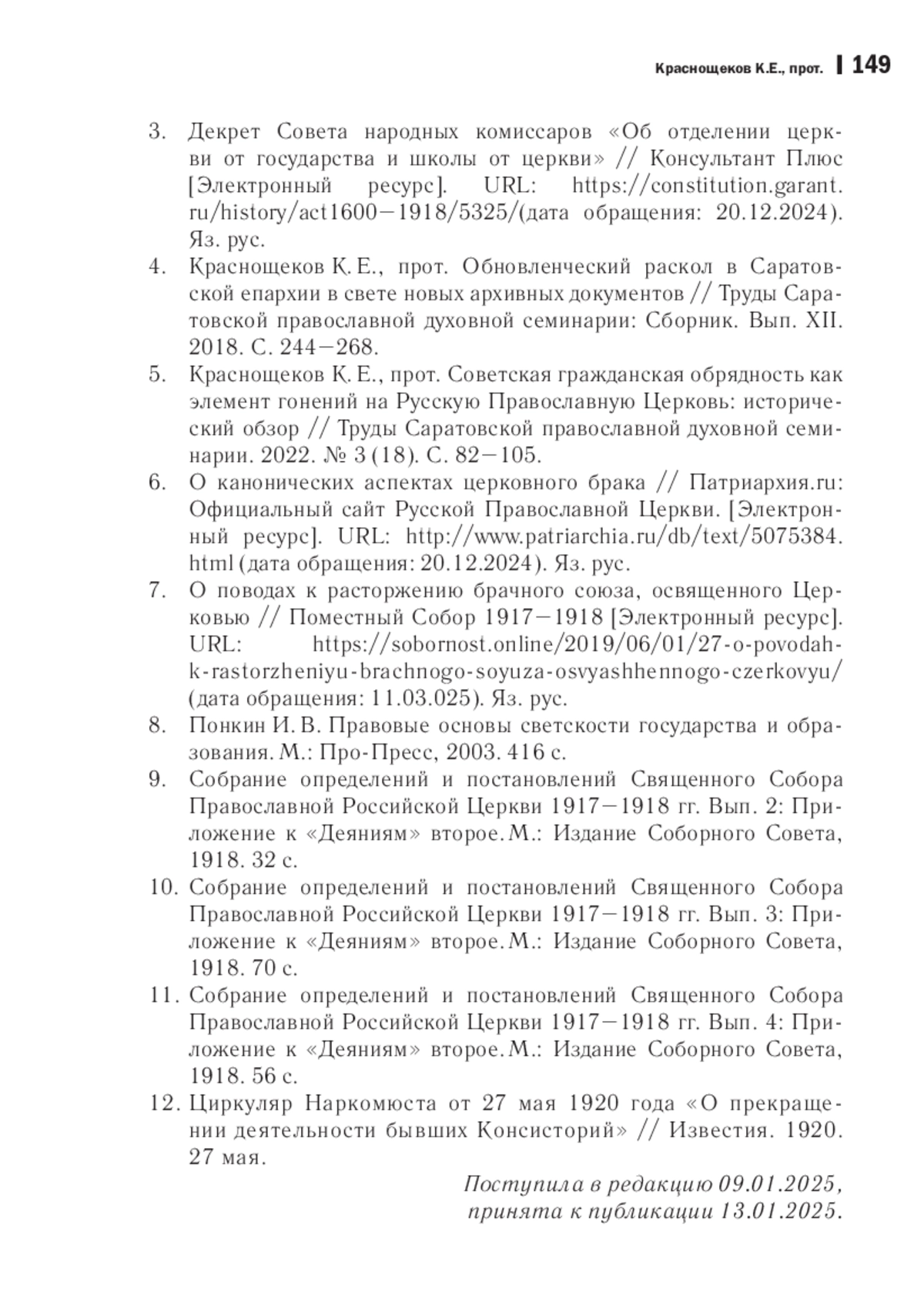 5. Краснощеков К. Е., прот. Советская гражданская обрядность как элемент гонений на Русскую Православную Церковь: исторический обзор // Труды Саратовской православной духовной семинарии. 2022. № 3 (18). С. 82-105. EDN: EMBUAN