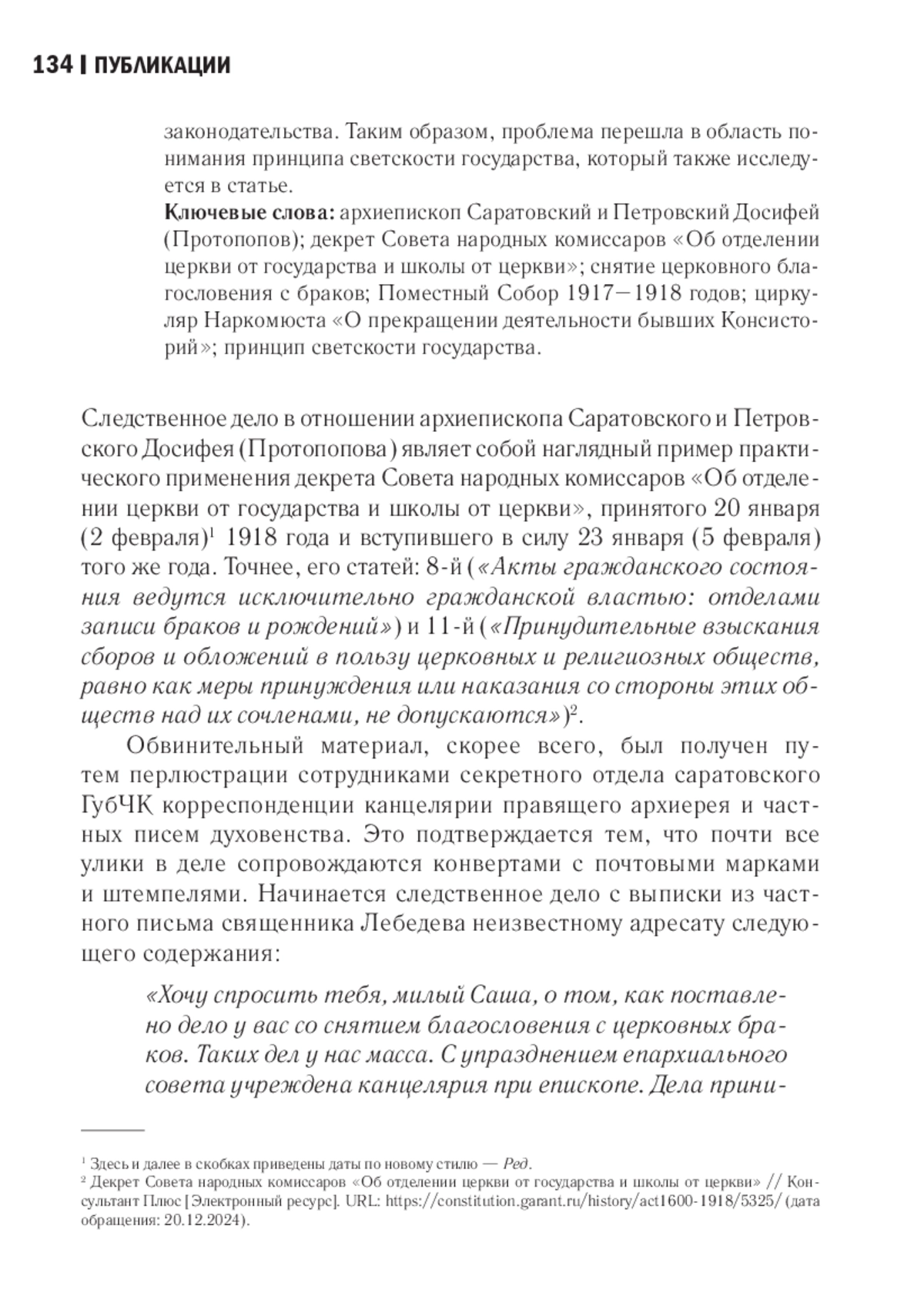 3. Декрет Совета народных комиссаров “Об отделении церкви от государства и школы от церкви” // Консультант Плюс [Электронный ресурс]. URL: https://constitution.garant.ru/history/act1600-1918/5325/ (дата обращения: 20.12.2024). Яз. рус.