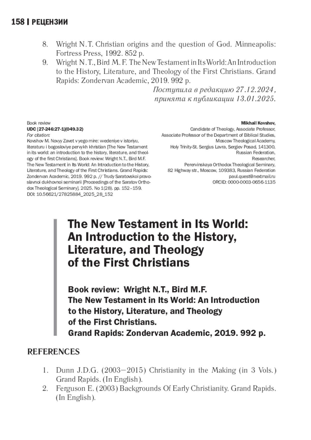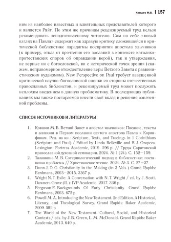 1. Ковшов М. В. Ветхий Завет и апостол язычников: Писание, тексты и аллюзии в Первом послании святого апостола Павла к Коринфянам. Рец. на кн.: Scripture, Texts, and Tracings in 1 Corinthians (Scripture and Paul) / Edited by Linda Belleville and B. J. Oropeza. Lexington: Fortress Academic, 2019. 296 p. // Труды Саратовской православной духовной семинарии. 2024. № 1 (24). С. 152-159. EDN: QSXACW