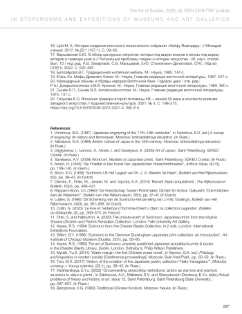 1. Voronova, B.G. (1987) ‘Japanese engraving of the 17th–19th centuries’, in Fedotova, E.D. (ed.) A survey of engraving: its history and techniques. Moscow: Izobrazitelnoye iskusstvo. (In Russ.)