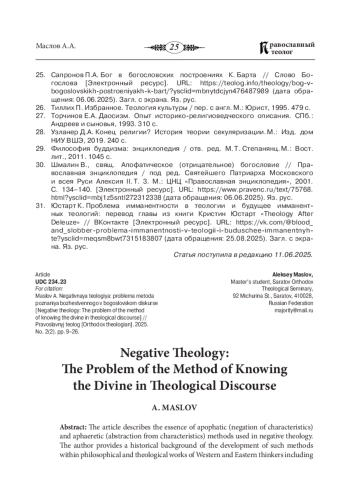 30. Шмалин В., свящ. Апофатическое (отрицательное) богословие // Православная энциклопедия под ред. Святейшего Патриарха /Московского и всея Руси Алексия II. Т. 3. М.: ЦНЦ “Православная энциклопедия”, 2001. С. 134-140. [Электронный ресурс]. URL: https://www.pravenc.ru/text/75768. (дата обращения: 06.06.2025). Яз. рус.