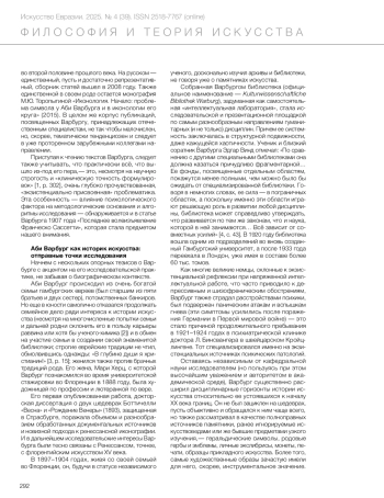 Собранная Варбургом библиотека (официальное наименование — Kulturwissenschaftliche Bibliothek Warburg), задуманная как самостоятельная «интеллектуальная лаборатория», стала исследовательской и презентационной площадкой по самым разнообразным направлениям гуманитарных (и не только) дисциплин. Причем ее системность заключалась в структурной подвижности, даже кажущейся хаотичности. Ученик и близкий соратник Варбурга Эдгар Винд отмечал: «По сравнению с другими специальными библиотеками она должна казаться причудливо фрагментарной… Ее фонды, посвященные отдельным областям, покажутся менее полными, чем можно было бы ожидать от специализированной библиотеки. Говоря в немногих словах, ее сила — в пограничных областях, а поскольку именно эти области играют решающую роль в развитии любой дисциплины, библиотека может справедливо утверждать, что развивается по тем же законам, что и наука, которой в ней занимаются… Всё зависит от совместных усилий» [4, с. 43]. В 1920 году библиотека вошла одним из подразделений во вновь созданный Гамбургский университет, а после 1933 года переехала в Лондон, уже имея в составе более 60 тыс. томов.