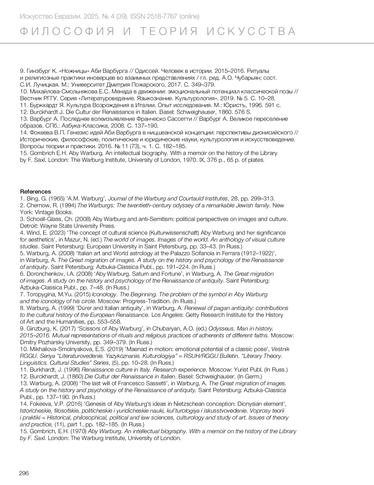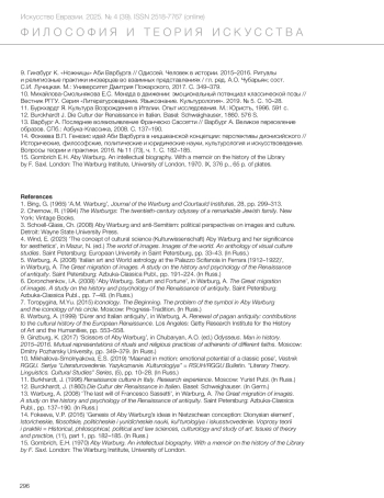 6. Doronchenkov, I.A. (2008) ‘Aby Warburg. Saturn and Fortune’, in Warburg, A. The Great migration of images. A study on the history and psychology of the Renaissance of antiquity. Saint Petersburg: Azbuka‑Classica Publ., pp. 7–48. (In Russ.)