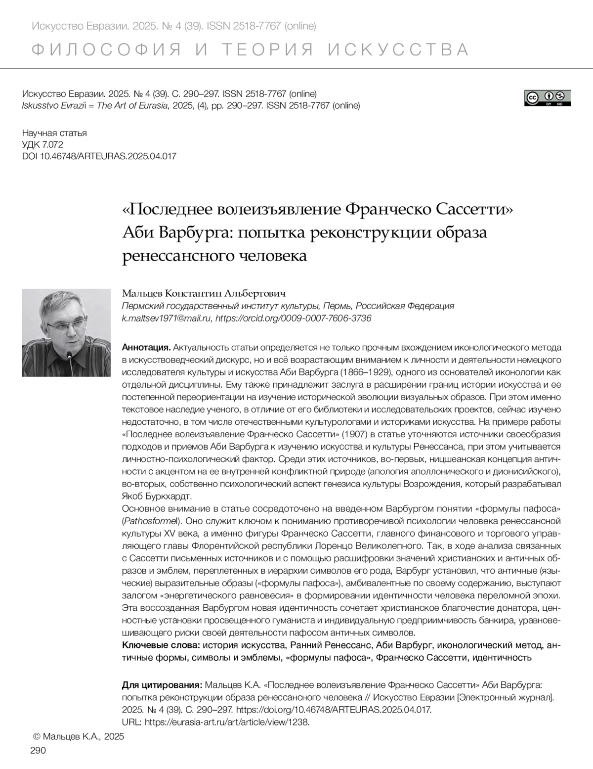 Мальцев К.А. «Последнее волеизъявление Франческо Сассетти» Аби Варбурга: попытка реконструкции образа ренессансного человека // Искусство Евразии [Электронный журнал].