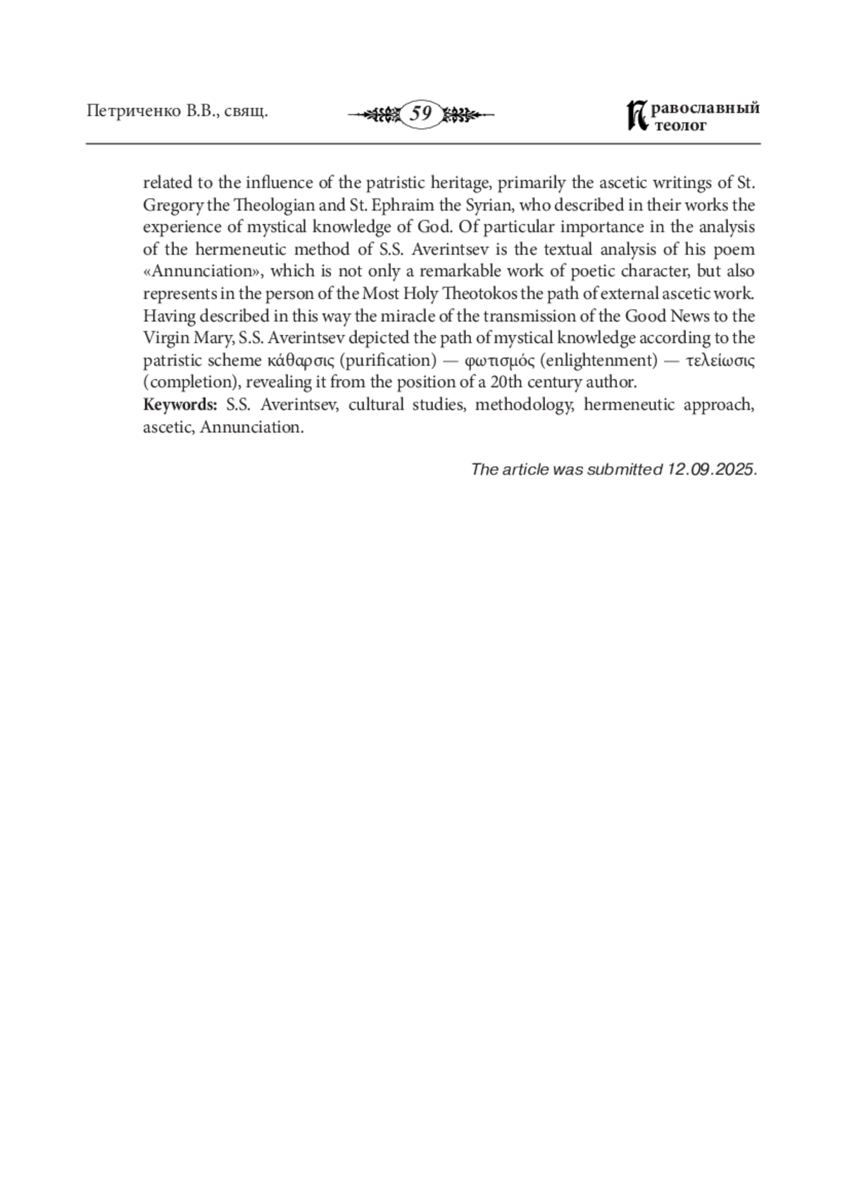 Предметом настоящего исследования является герменевтический метод С. С. Аверинцева. Автором делается попытка сформулировать его основные принципы. Высказывается предположение, что своеобразие и уникальность метода, выработанного С. С. Аверинцевым, обусловлены влиянием святоотеческого наследия, в первую очередь, аскетических сочинений святителя Григория Богослова и преподобного Ефрема Сирина, описавших в своих трудах опыт мистического богопознания. Особую значимость при анализе данного метода имеет текстуальный анализ его стихотворения «Благовещение», которое являет собой не только замечательное произведение поэтического характера, но и представляет в лице Пресвятой Богородицы путь внешнего аскетического делания. Описав подобным образом чудо передачи Благой вести Деве Марии, С. С. Аверинцев изобразил путь мистического познания согласно святоотеческой схеме «κάθαρσις (очищение) - φωτισμός (просветление) - τελείωσις (завершение)», раскрыв его с позиции автора XX столетия.