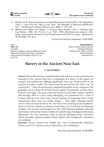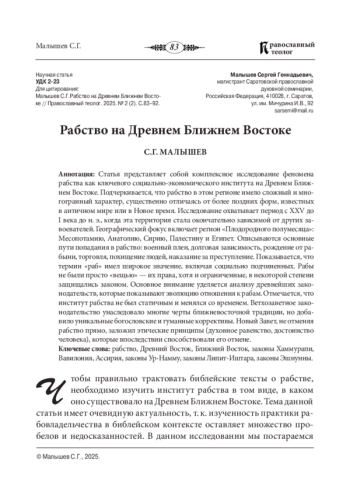 Статья представляет собой комплексное исследование феномена рабства как ключевого социально-экономического института на Древнем Ближнем Востоке. Подчеркивается, что рабство в этом регионе имело сложный и многогранный характер, существенно отличаясь от более поздних форм, известных в античном мире или в Новое время. Исследование охватывает период с XXV до I века до н. э., когда эта территория стала окончательно зависимой от других завоевателей. Географический фокус включает регион «Плодородного полумесяца»: Месопотамию, Анатолию, Сирию, Палестину и Египет. Описываются основные пути попадания в рабство: военный плен, долговая зависимость, рождение от рабыни, торговля, похищение людей, наказание за преступление. Показывается, что термин «раб» имел широкое значение, включая социально подчиненных. Рабы не были просто «вещью» - их права, хотя и ограниченные, в некоторой степени защищались законом. Основное внимание уделяется анализу древнейших законодательств, которые показывают эволюцию отношения к рабам. Отмечается, что институт рабства не был статичным и менялся со временем. Ветхозаветное законодательство унаследовало многие черты ближневосточной традиции, но добавило уникальные богословские и гуманные коррективы. Новый Завет, не отменяя рабство прямо, заложил этические принципы (духовное равенство, достоинство человека), которые впоследствии способствовали его отмене.