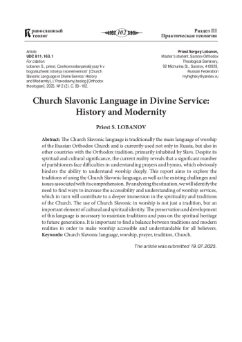 Церковнославянский язык традиционно является основным богослужебным языком Русской Православной Церкви и в настоящее время используется не только в России, но и в других странах с православной традицией, преимущественно населенных славянами. Современная реальность показывает, что, несмотря на культурное и духовное значение церковнославянского языка, большинство прихожан испытывает трудности с пониманием песнопений и молитв. Это, безусловно, препятствует глубокому пониманию богослужений. В данной статье рассматриваются традиции использования церковнославянского языка, а также актуальные проблемы и трудности его восприятия. Анализ ситуации показывает необходимость поиска путей для повышения уровня понимания церковнославянских текстов прихожанами. Подчеркивается, что церковнославянский язык в богослужении - это не просто традиция, а важный элемент культурной и духовной идентичности, необходимый для сохранения богатого наследия и передачи духовного опыта будущим поколениям. Необходимо научиться находить баланс между прошлыми и современными реалиями, чтобы сделать богослужение доступным и понятным для всех верующих.