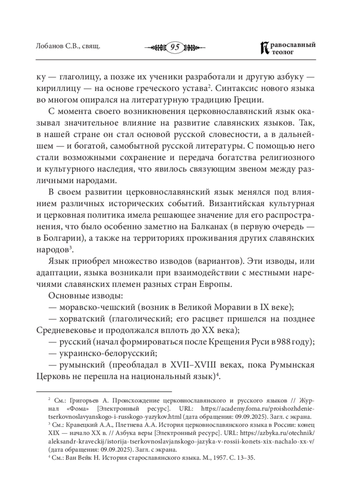 4. Григорьев А. Происхождение церковнославянского и русского языков // Журнал “Фома” [Электронный ресурс]. URL: https://academy.foma.ru/proishozhdenie-tserkovnoslavyanskogo-i-russkogo-yazykov.html (дата обращения: 09.09.2025). Загл. с экрана. Яз. рус.
