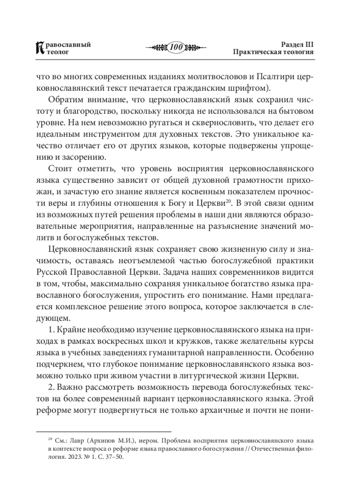 8. Лавр (Архипов М.И.), иером. Проблема восприятия церковнославянского языка в контексте вопроса о реформе языка православного богослужения // Отечественная филология. 2023. № 1. С. 37-50.