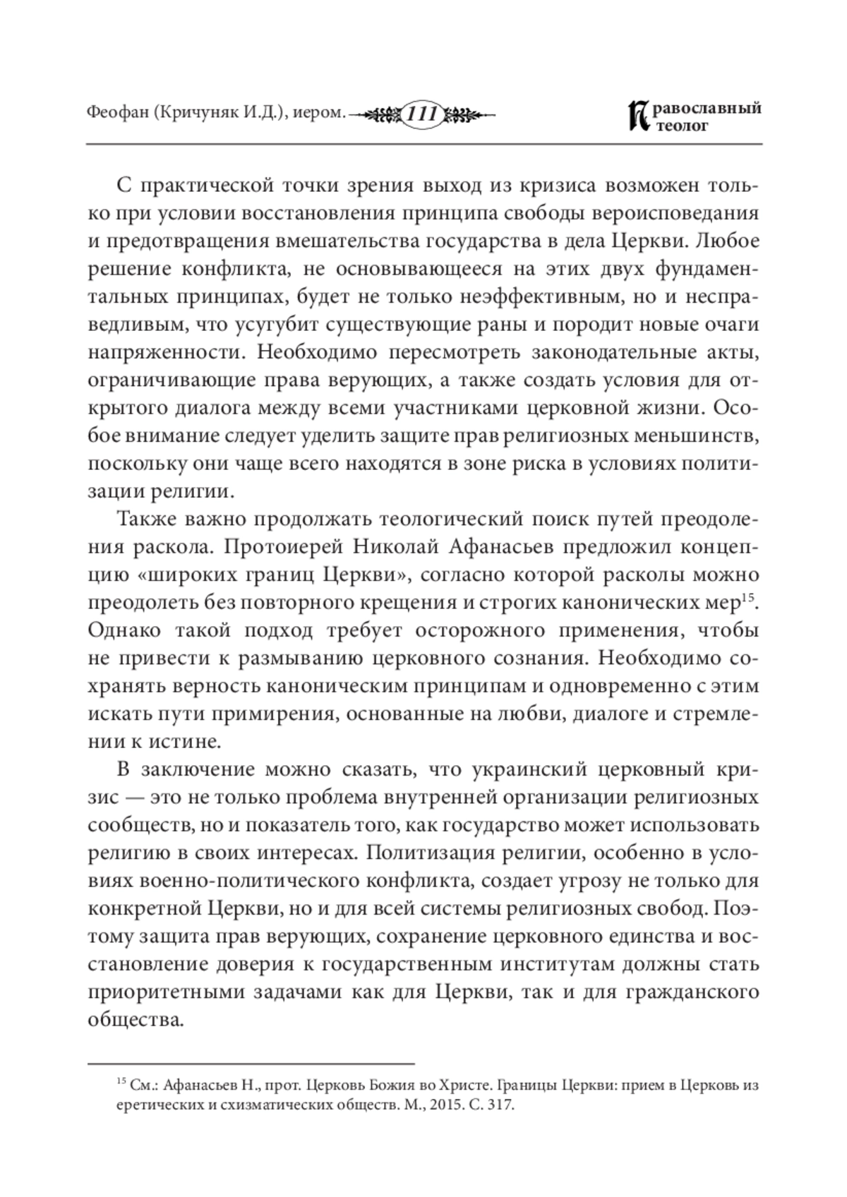 В статье рассматривается украинский церковный кризис как результат активного вмешательства государства в дела Церкви. Автор анализирует юридические, канонические и социальные аспекты создания «Православной церкви Украины» (ПЦУ) и последствия этого процесса для традиционных конфессий, в особенности для Украинской Православной Церкви (УПЦ). Текст работы затрагивает вопросы расширения государственного контроля над деятельностью конфессиональных организаций и возможные способы их разрешения. Рассматриваются факты административного давления, насильственных захватов храмов, ограничения свободы вероисповедания и международной реакции на эти события. Особое внимание уделено богословскому осмыслению раскола и возможным путям его преодоления. Статья подчеркивает необходимость восстановления принципа светскости государства, защиты прав религиозных меньшинств возобновления диалога внутри церковного пространства.