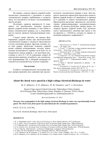 Ахметов М. Н., Ахметов Н. Д., Гимадеев М. М., Кривошеев В. А. О скорости фронта ударной волны при высоковольтном электрическом разряде в воде 53