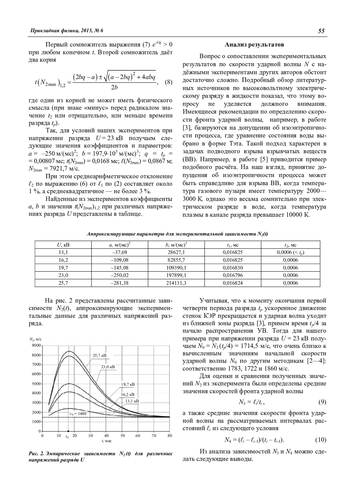 В работе экспериментально исследован процесс распространения волн давления при высоковольтном электрическом разряде в воде. Для широкого диапазона параметров определена скорость фронта ударной волны и её зависимость от времени и от удаления от канала электрического разряда. Представлены расчетные зависимости, достаточно хорошо аппроксимирующие экспериментальные данные. Из анализа расчётных данных видно, что скорость фронта ударной волны N2(t) достигает своего максимального значения при одном и том же времени tN = 0,0168 мс, которое не зависит от величины разрядного напряжения U.
