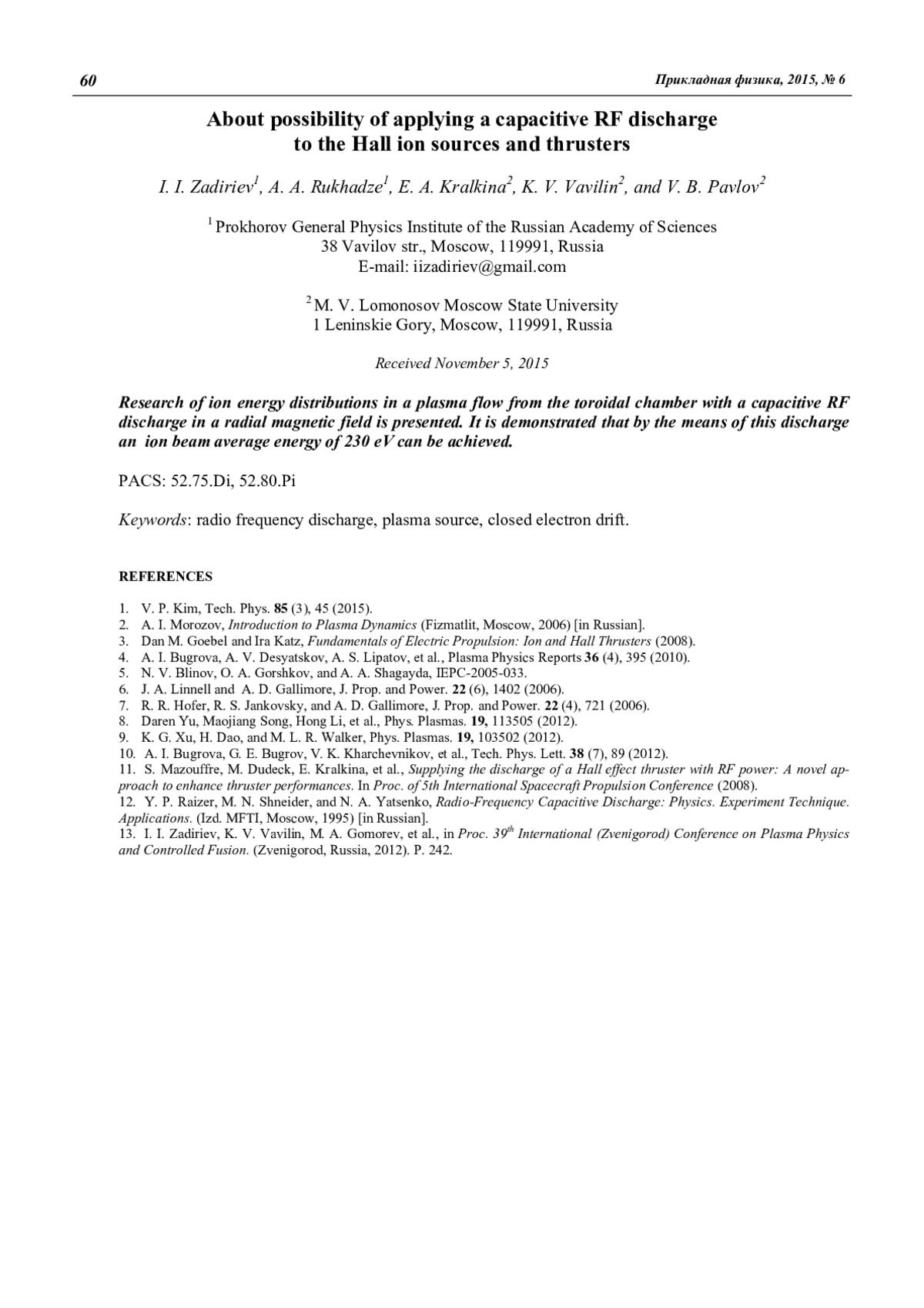 Задириев И. И., Рухадзе А. А., Кралькина Е. А., Вавилин К. В., Павлов В. Б. О возможности использования емкостного ВЧ-разряда в источнике плазмы с замкнутым дрейфом электронов 57