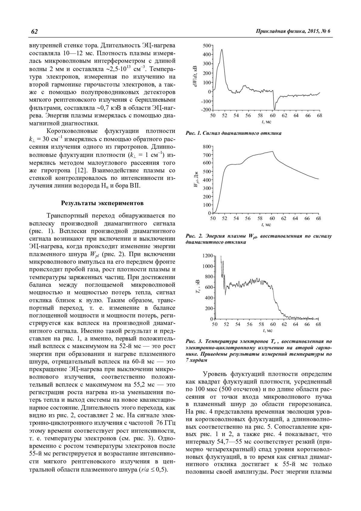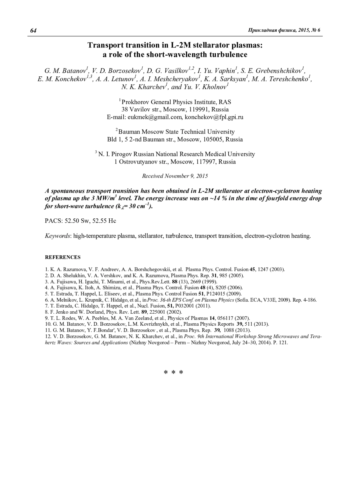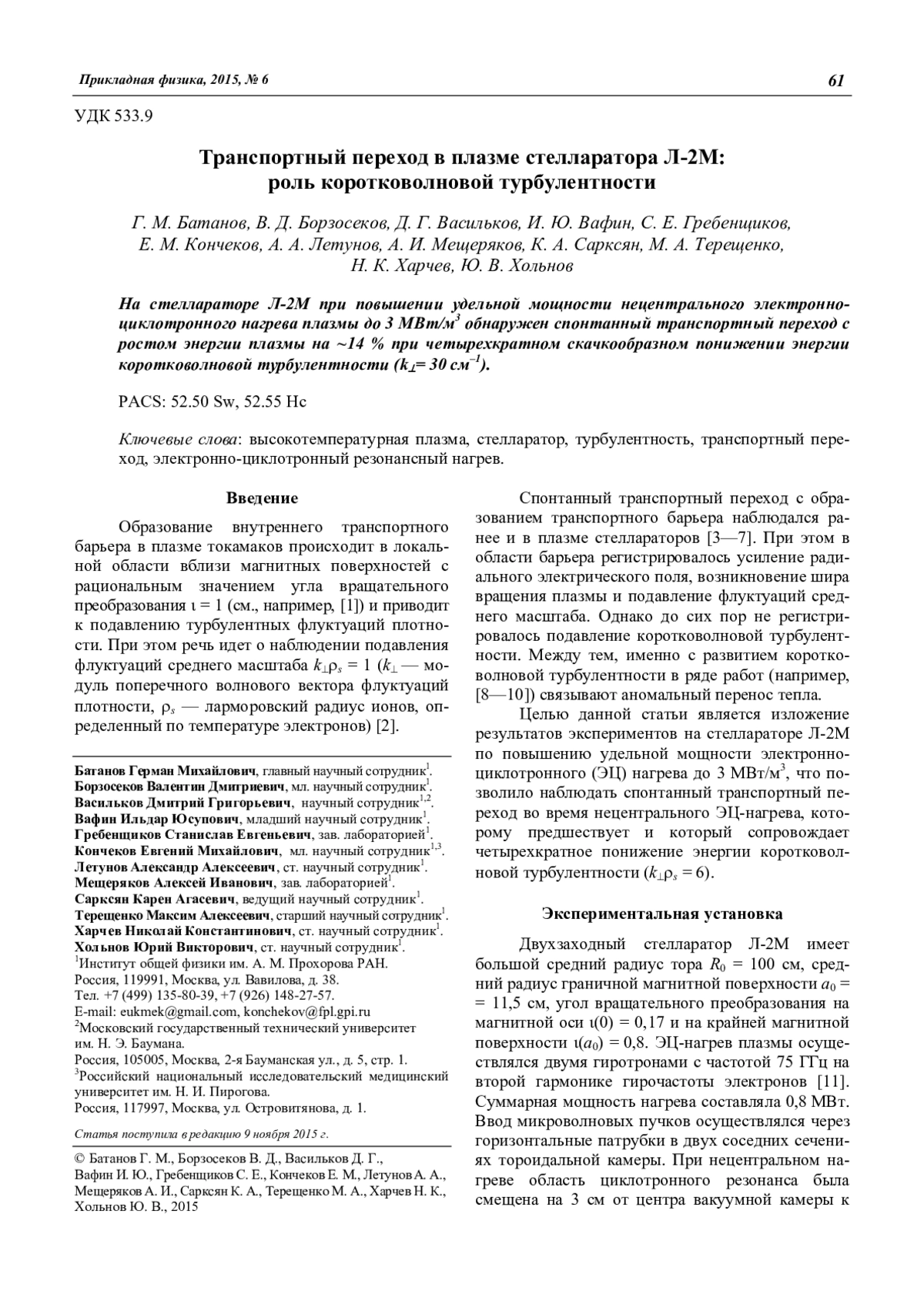 Батанов Г. М., Борзосеков В. Д., Васильков Д. Г., Вафин И. Ю., Гребенщиков С. Е., Кончеков Е. М., Летунов А. А., Мещеряков А. И., Сарксян К. А., Терещенко М. А., Харчев Н. К., Хольнов Ю. В. Транспортный переход в плазме стелларатора Л-2М: роль коротковолновой турбулентности 61