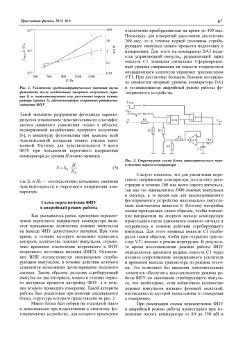 В результате проведенного экспериментального исследования фотодиодов, подверженных разрушающему воздействию лазерным излучением, была получена зависимость увеличения шумов от уровня мощности излучения. Это позволило в зависимости от мощности воздействия на ФПУ дать оценку уровня порога компаратора, необходимого для обеспечения заданной вероятности ложной регистрации после воздействия. Для повышения порога компаратора из начального состояния на необходимый уровень после мощной засветки ФПУ была разработана специальная схема, испытания которой проводились при имитации увеличения шума фотодиода увеличением напряжения смещения на нем.