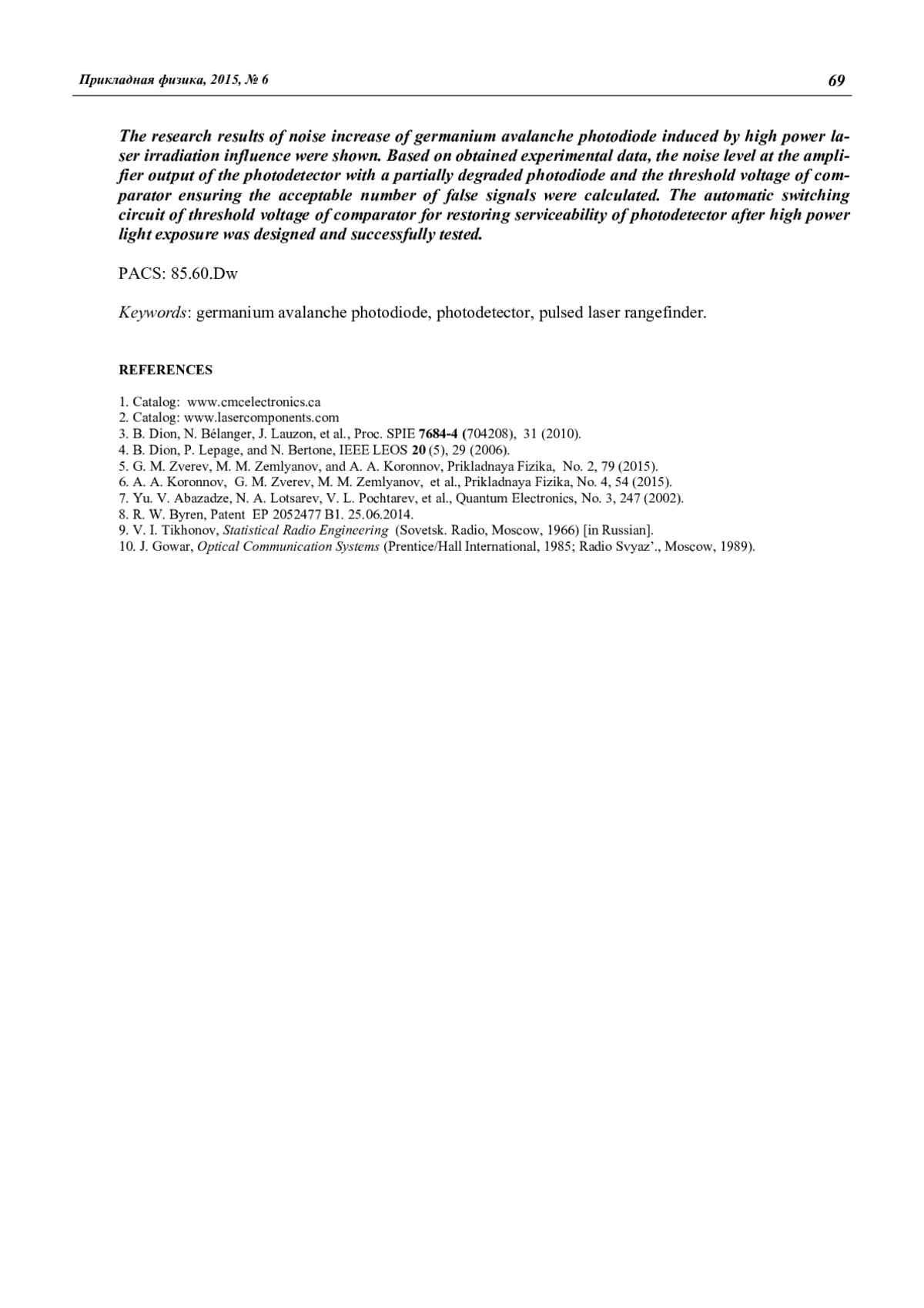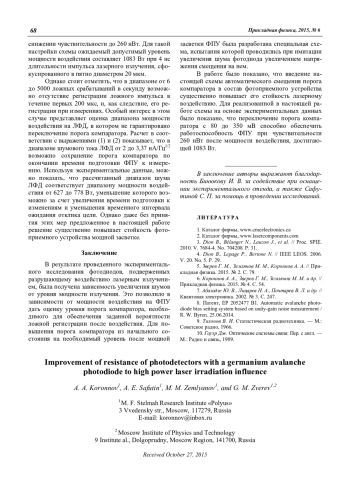 А. А. Koronnov, A. E. Safutin, М. М. Zemlyanov, and G. M. Zverev Improvement of resistance of photodetectors with a germanium avalanche photodiode to high power laser irradiation influence 65