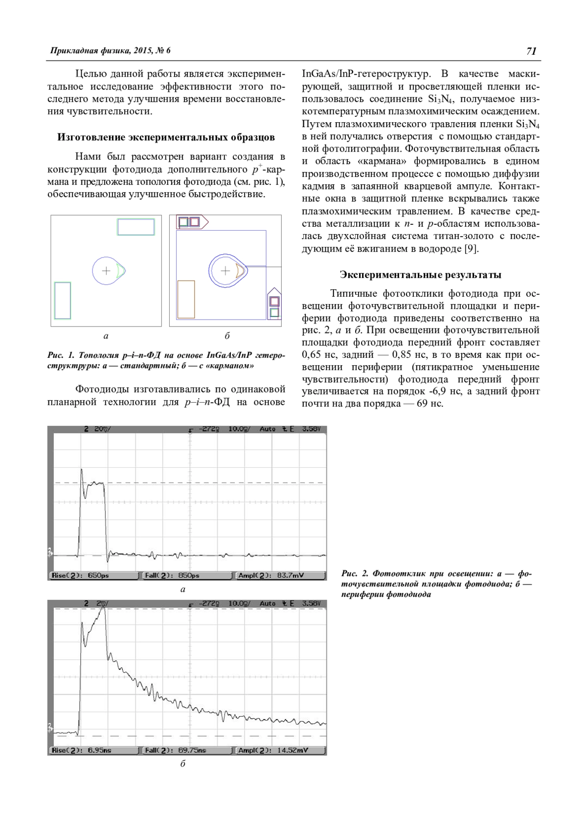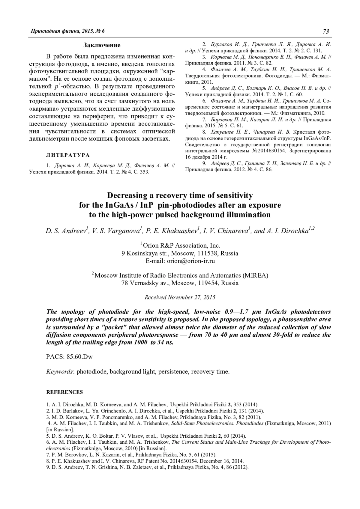 Андреев Д. С., Варганова В. С., Хакуашев П. Е., Чинарева И. В., Дирочка А. И. Уменьшение времени восстановления чувствительности в p–i–n-фотодиодах на основе InGaAs/InP после воздействия мощных импульсных фоновых засветок 70
