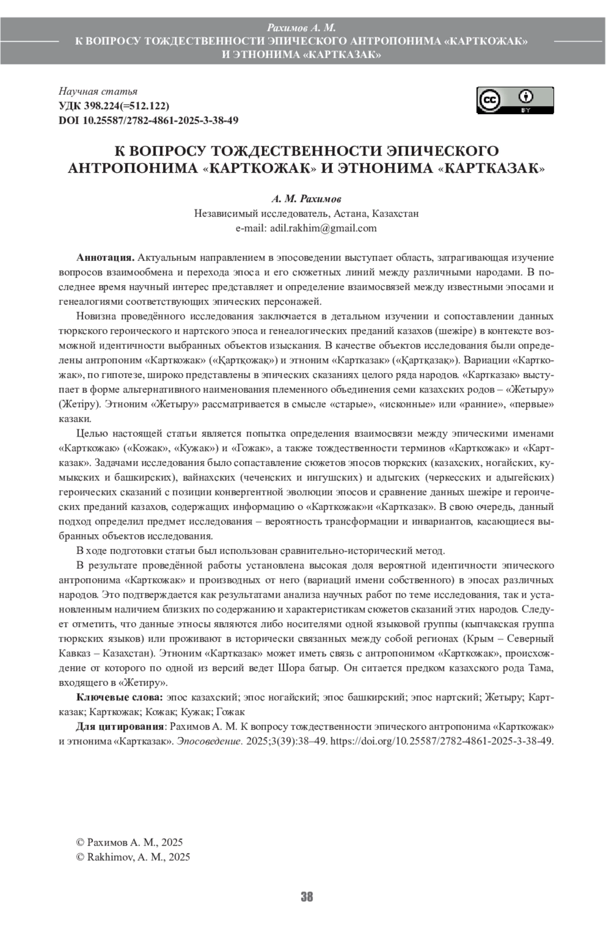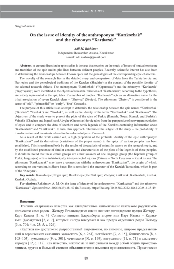 Целью настоящей статьи является попытка определения взаимосвязи между эпическими именами «Карткожак» («Кожак», «Кужак») и «Гожак», а также тождественности терминов «Карткожак» и «Картказак». Задачами исследования было сопаставление сюжетов эпосов тюркских (казахских, ногайских, кумыкских и башкирских), вайнахских (чеченских и ингушских) и адыгских (черкесских и адыгейских) героических сказаний с позиции конвергентной эволюции эпосов и сравнение данных шежіре и героических преданий казахов, содержащих информацию о «Карткожак»и «Картказак». В свою очередь, данный подход определил предмет исследования – вероятность трансформации и инвариантов, касающиеся выбранных объектов исследования.