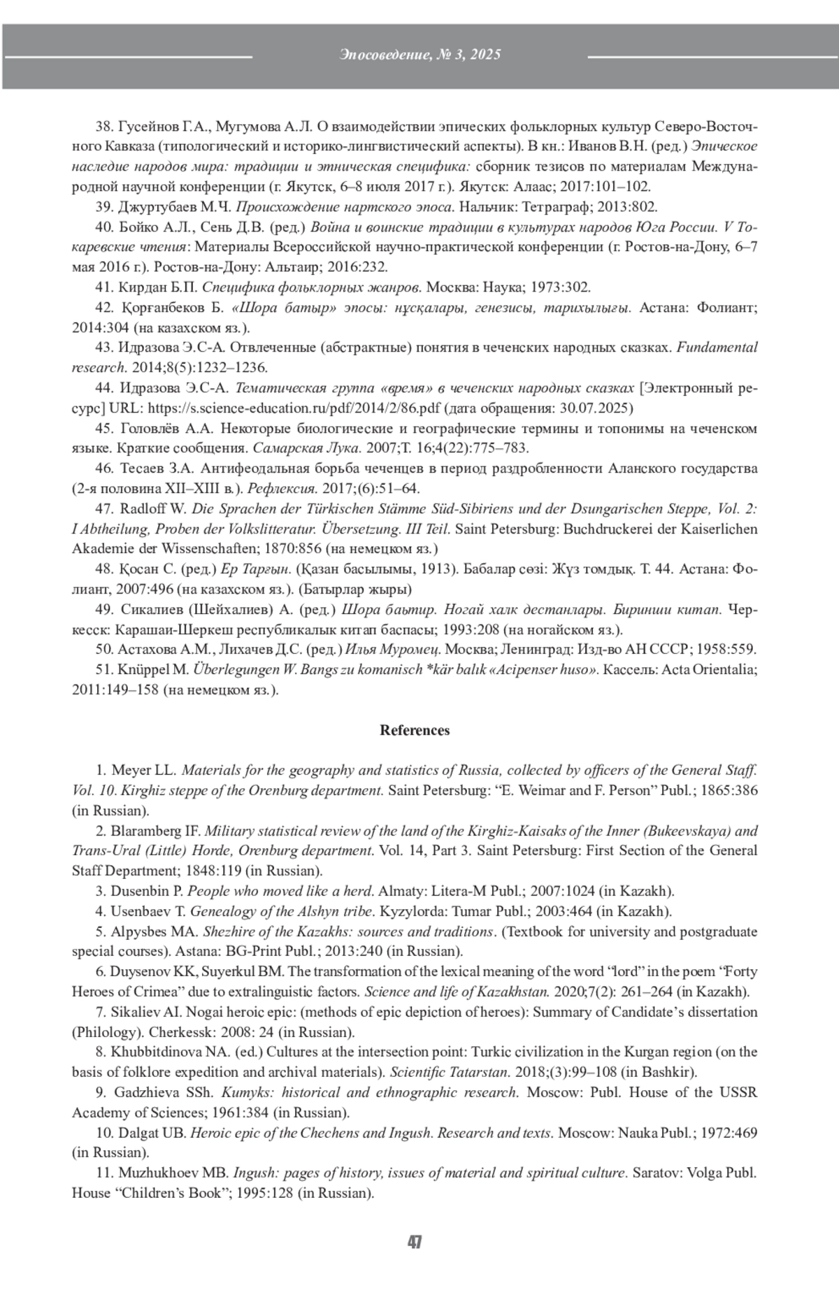 6. Дуйсенов К.К., Сүйерқұл Б.М. “Қырымның қырық батыры” жырындағы “мырза” сөзi лексикалық мағынасының экстралингвистикалық факторларға байланысты түрленуi. Наука и жизнь Казахстана. 2020;7(2):261-264 (на казахском яз.).