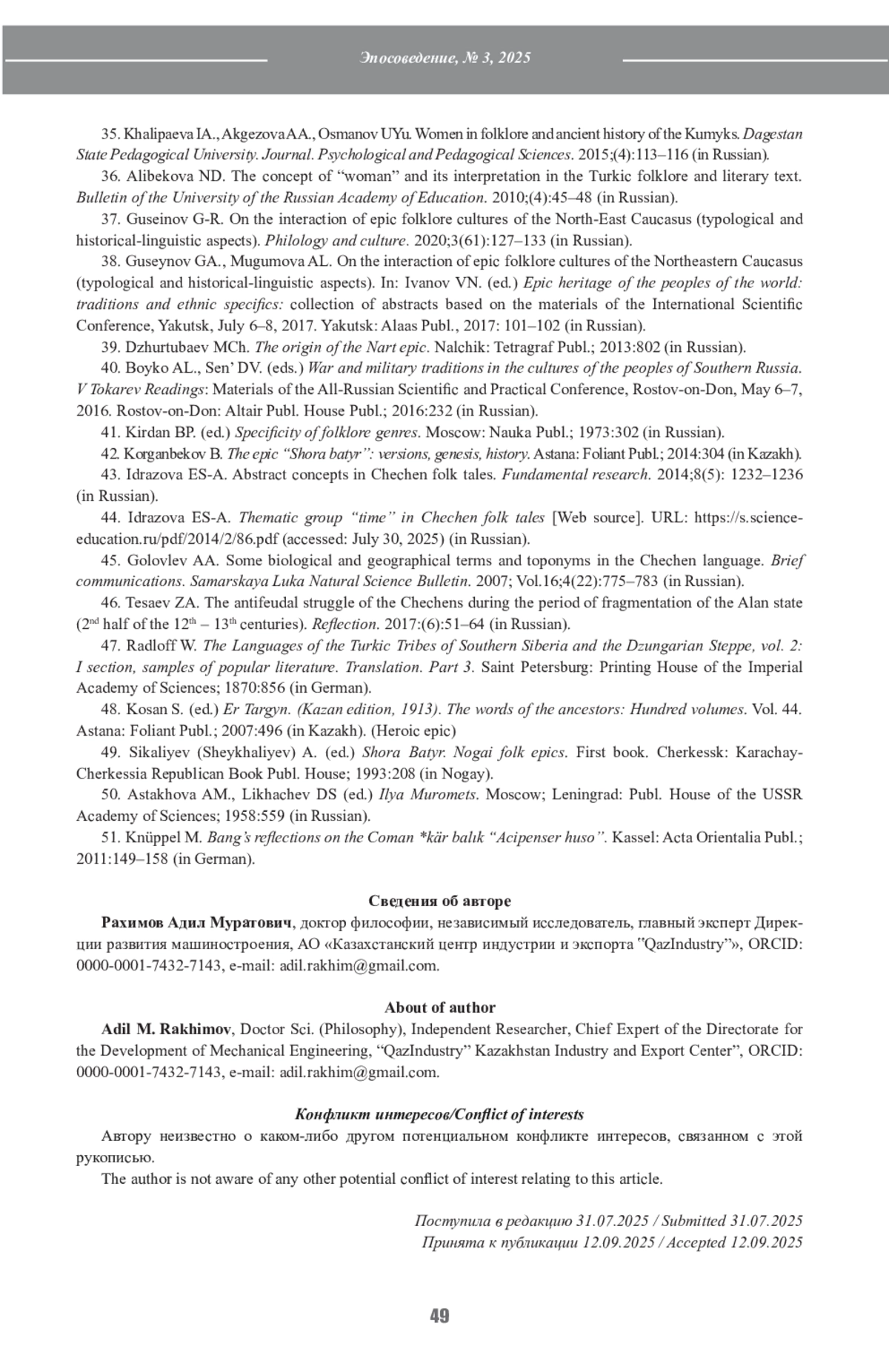 37. Гусейнов Гарун-Рашид. О взаимодействии эпических фольклорных культур Северо-Восточного Кавказа (типологический и историко-лингвистический аспекты). Филология и культура. Philology and culture. 2020;3(61): 127-133.