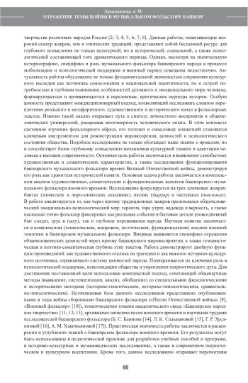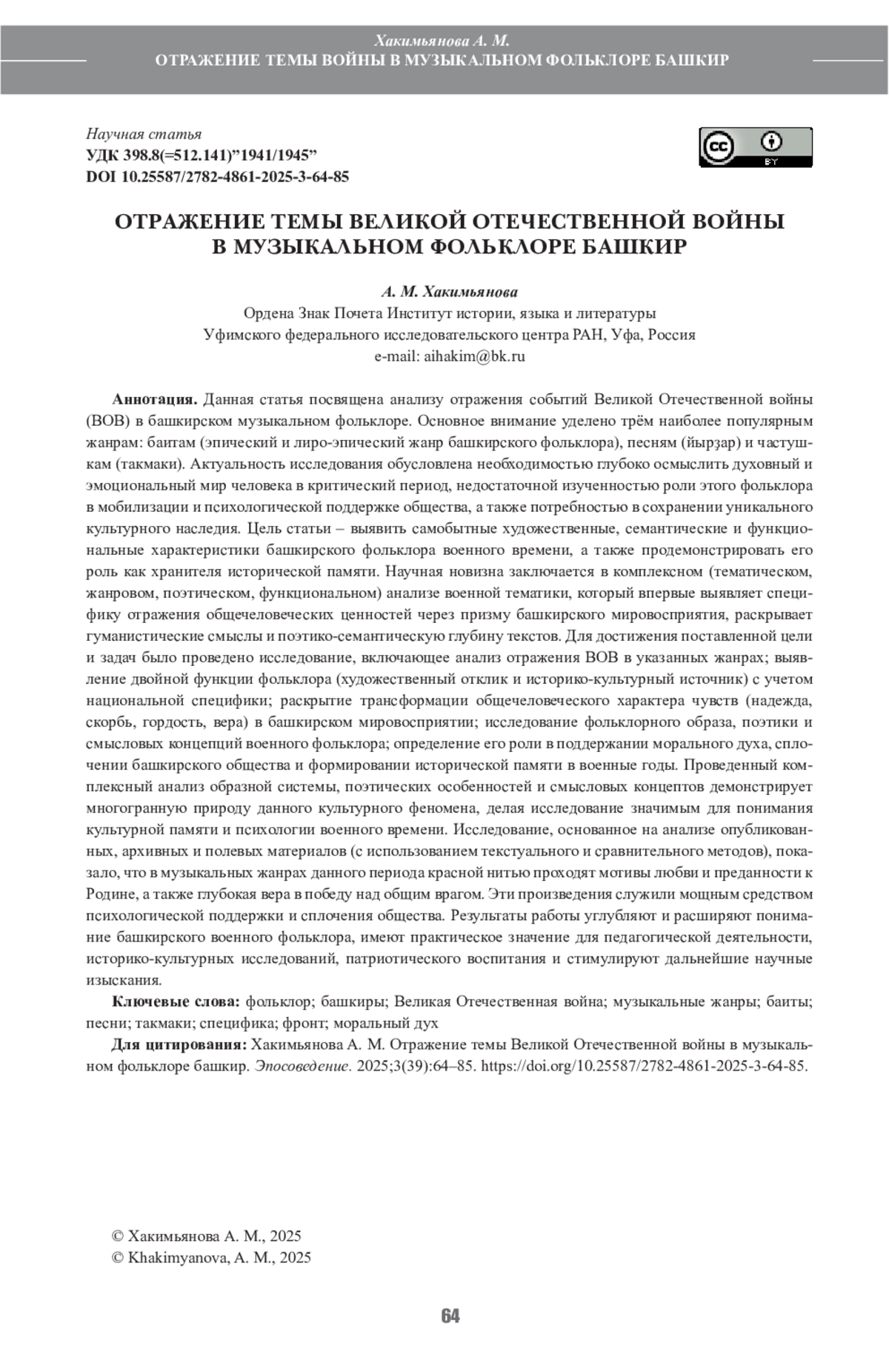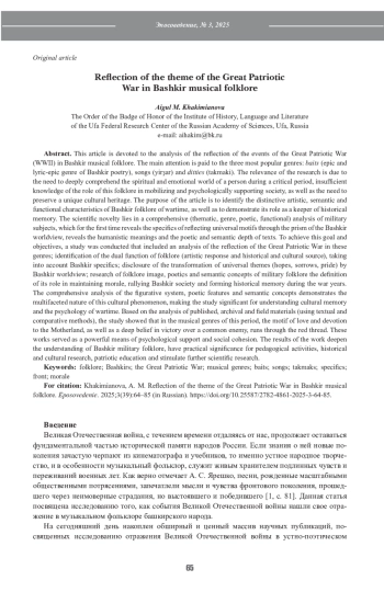 Данная статья посвящена анализу отражения событий Великой Отечественной войны (ВОВ) в башкирском музыкальном фольклоре. Основное внимание уделено трём наиболее популярным жанрам: баитам (эпический и лиро-эпический жанр башкирского фольклора), песням (йырҙар) и частушкам (такмаки). Актуальность исследования обусловлена необходимостью глубоко осмыслить духовный и эмоциональный мир человека в критический период, недостаточной изученностью роли этого фольклора в мобилизации и психологической поддержке общества, а также потребностью в сохранении уникального культурного наследия. Цель статьи – выявить самобытные художественные, семантические и функциональные характеристики башкирского фольклора военного времени, а также продемонстрировать его роль как хранителя исторической памяти. Научная новизна заключается в комплексном (тематическом, жанровом, поэтическом, функциональном) анализе военной тематики, который впервые выявляет специфику отражения общечеловеческих ценностей через призму башкирского мировосприятия, раскрывает гуманистические смыслы и поэтико-семантическую глубину текстов. Для достижения поставленной цели и задач было проведено исследование, включающее анализ отражения ВОВ в указанных жанрах; выявление двойной функции фольклора (художественный отклик и историко-культурный источник) с учетом национальной специфики; раскрытие трансформации общечеловеческого характера чувств (надежда, скорбь, гордость, вера) в башкирском мировосприятии; исследование фольклорного образа, поэтики и смысловых концепций военного фольклора; определение его роли в поддержании морального духа, сплочении башкирского общества и формировании исторической памяти в военные годы. Проведенный комплексный анализ образной системы, поэтических особенностей и смысловых концептов демонстрирует многогранную природу данного культурного феномена, делая исследование значимым для понимания культурной памяти и психологии военного времени. Исследование, основанное на анализе опубликованных, архивных и полевых материалов (с использованием текстуального и сравнительного методов), показало, что в музыкальных жанрах данного периода красной нитью проходят мотивы любви и преданности к Родине, а также глубокая вера в победу над общим врагом. Эти произведения служили мощным средством психологической поддержки и сплочения общества. Результаты работы углубляют и расширяют понимание башкирского военного фольклора, имеют практическое значение для педагогической деятельности, историко-культурных исследований, патриотического воспитания и стимулируют дальнейшие научные изыскания.