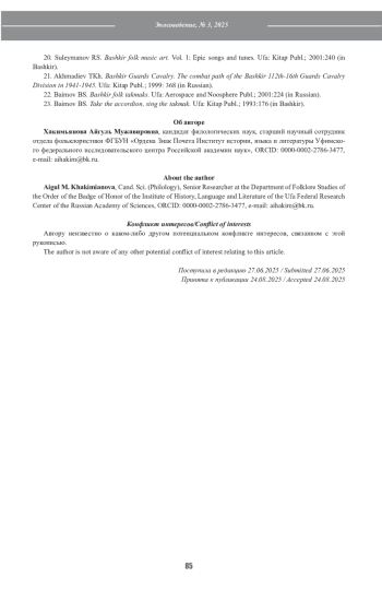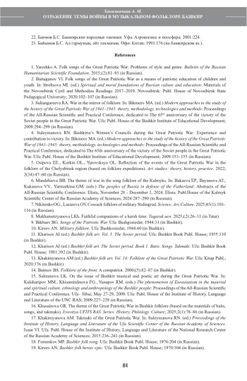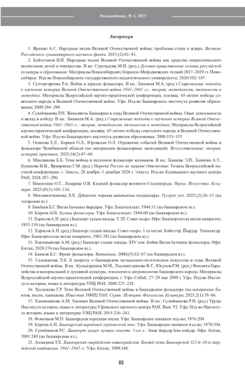 16. Хусаинова Г.Р. Тема Великой Отечественной войны в башкирском фольклоре (на материалах баитов, песен, такмаков). Известия УФИЦ РАН. Серия: История. Филология. Культура; 2025;2(1):78-86.