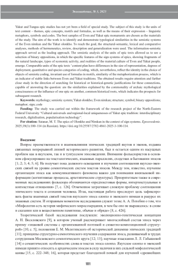 Настоящая статья посвящена исследованию коммуникативного аспекта устного народного творчества. Проблема изучения взаимосвязей эпических произведений якутов и эвенов на уровне знаковых систем и в якутской, и в тунгусской эпосоведческой науке еще не была полем специального изучения. Предметом настоящего исследования предстают единицы содержания текста – темы, эпические концепты, мотивы и формулы, а также средства их выражения – языковые метафоры, символы, коды. Материалами исследования выбраны лучшие образцы эпических памятников эвенов и якутов. Цель работы – выявить и проанализировать типологические схождения в семиотических системах эвенского нимкан и якутского олонхо. В решении поставленной цели применяются структурно-семантический, лексический и сравнительный анализы, методы герменевтики, обзора, описания и обобщения. Ведущим подходом послужил информационно-семиотический подход. Семиотический анализ единиц эпических текстов позволил увидеть подбор бинарных оппозиций, в которых вырисовываются специфические черты знаковых систем эпосов, демонстрирующих фрагменты природного ландшафта, видов хозяйственной деятельности, реалий материальной культуры эвенов и якутов. Сравниваемые единицы плана содержания эпических текстов имеют различия в размерах репрезентации, степенях развернутости, количественных и видовых категориях кодирования, которые, тем не менее, отражают тождественность в выборе объектов семиотических кодирований, инвариантные применения формул в мотивах, аналогичность процесса метафоризации, что и предстает индикатором устойчивых связей между эвенскими и якутскими традициями. Полученные результаты требуют внимания и дальнейшего пристального изучения в направлении поиска исторического или историко-генетического обоснования этих связей, способных ответить на вопрос: объясняются ли сходства общностью архаического мифологического сознания или влиянием одного эпоса на другой, общими историческими корнями, что и обозначает перспективы последующих исследований.