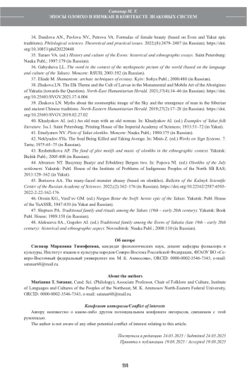33. Сатанар М.Т., Илларионов В.В. Модель мира саха: семантика в ракурсе геометрии форм (на материале якутского эпоса). Российский гуманитарный журнал. 2018;(6):471-481. DOI: 10.15643/libartrus-2018.6.4