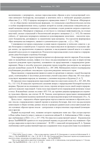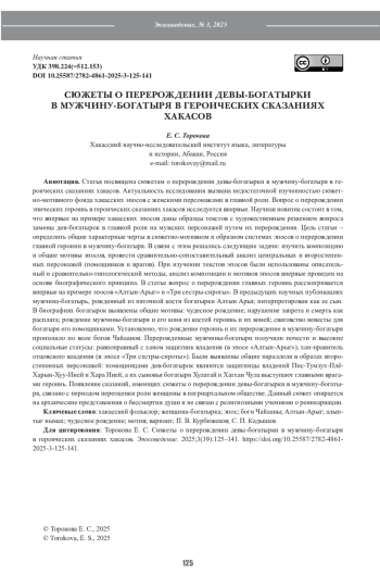 Статья посвящена сюжетам о перерождении девы-богатырки в мужчину-богатыря в героических сказаниях хакасов. Актуальность исследования вызвана недостаточной изученностью сюжетно-мотивного фонда хакасских эпосов с женскими персонажами в главной роли. Вопрос о перерождении эпических героинь в героических сказаниях хакасов исследуется впервые. Научная новизна состоит в том, что впервые на примере хакасских эпосов даны образцы текстов с художественным решением вопроса замены дев-богатырок в главной роли на мужских персонажей путем их перерождения. Цель статьи – определить общие характерные черты в сюжетно-мотивном и образном системах эпосов о перерождении главной героини в мужчину-богатыря. В связи с этим решались следующие задачи: изучить композицию и общие мотивы эпосов, провести сравнительно-сопоставительный анализ центральных и второстепенных персонажей (помощников и врагов). При изучении текстов эпосов были использованы описательный и сравнительно-типологический методы, анализ композиции и мотивов эпосов впервые проведен на основе биографического принципа. В статье вопрос о перерождении главных героинь рассматривается впервые на примере эпосов «Алтын-Арыг» и «Три сестры-сироты». В предыдущих научных публикациях мужчина-богатырь, рожденный из пяточной кости богатырки Алтын Арыг, интерпретирован как ее сын. В биографиях богатырок выявлены общие мотивы: чудесное рождение; нарушение запрета и смерть как расплата; рождение мужчины-богатыря и его коня из костей героинь и их коней; сватовство невесты для богатыря его помощниками. Установлено, что рождение героинь и их перерождение в мужчину-богатыря произошло по воле богов Чайаанов. Перерожденные мужчины-богатыри получили почести и высокие социальные статусы: равноправный с ханом защитник владения (в эпосе «Алтын-Арыг»), хан-правитель отцовского владения (в эпосе «Три сестры-сироты»). Были выявлены общие параллели в образах второстепенных персонажей: помощницами дев-богатырок являются защитницы владений Пис-Тумзух-Плё- Харын-Хуу-Иней и Хара Иней, а их сыновья богатыри Хулатай и Хатхан Чула выступают главными врагами героинь. Появление сказаний, имеющих сюжеты о перерождении девы-богатырки в мужчину-богатыря, связано с периодом переоценки роли женщины в патриархальном обществе. Данный сюжет опирается на архаические представления о бессмертии души и не связан с религиозными учениями о реинкарнации.