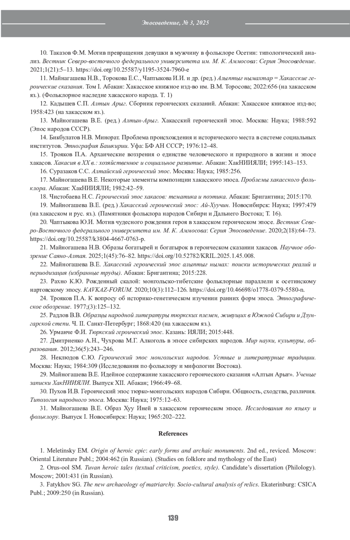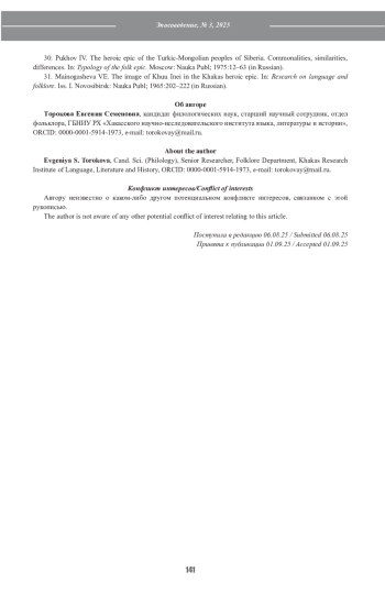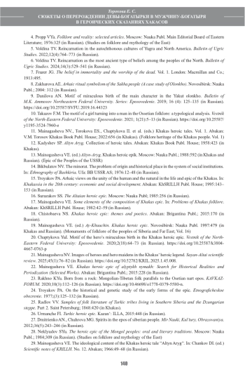 21. Майногашева Н.В. Образы богатырей и богатырок в героическом сказании хакасов. Научное обозрение Саяно-Алтая. 2025;1(45):76-82. DOI: 10.52782/KRIL.2025.1.45.008