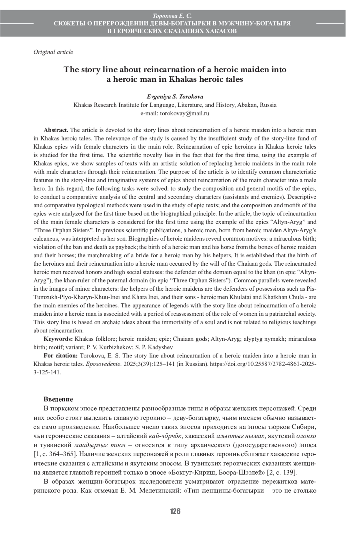 20. Чаптыкова Ю.И. Мотив чудесного рождения героя в хакасском героическом эпосе. Вестник Северо-Восточного федерального университета им. М. К. Аммосова: Серия Эпосоведение. 2020;2(18):64-73. DOI: 10.25587/k3804-4667-0763-p